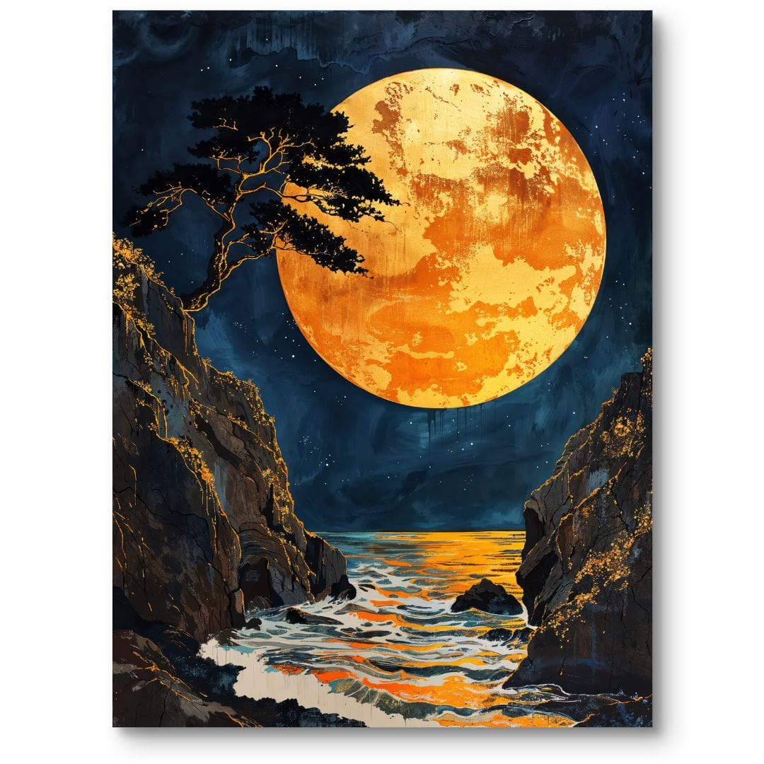 Prezentowany obraz przenosi nas w intrygujący świat nocnego krajobrazu – rozświetlony, majestatyczny księżyc zawieszony nad spokojnym morzem otoczonym surowymi skałami. Kompozycja uderza mistyczną atmosferą pełną niedopowiedzeń, a subtelny surrealizm podkreśla wyjątkowość scenerii. Zestawienie ciepłego, pomarańczowego blasku księżyca z chłodnymi odcieniami granatu tworzy niepowtarzalny i przyciągający uwagę kontrast.