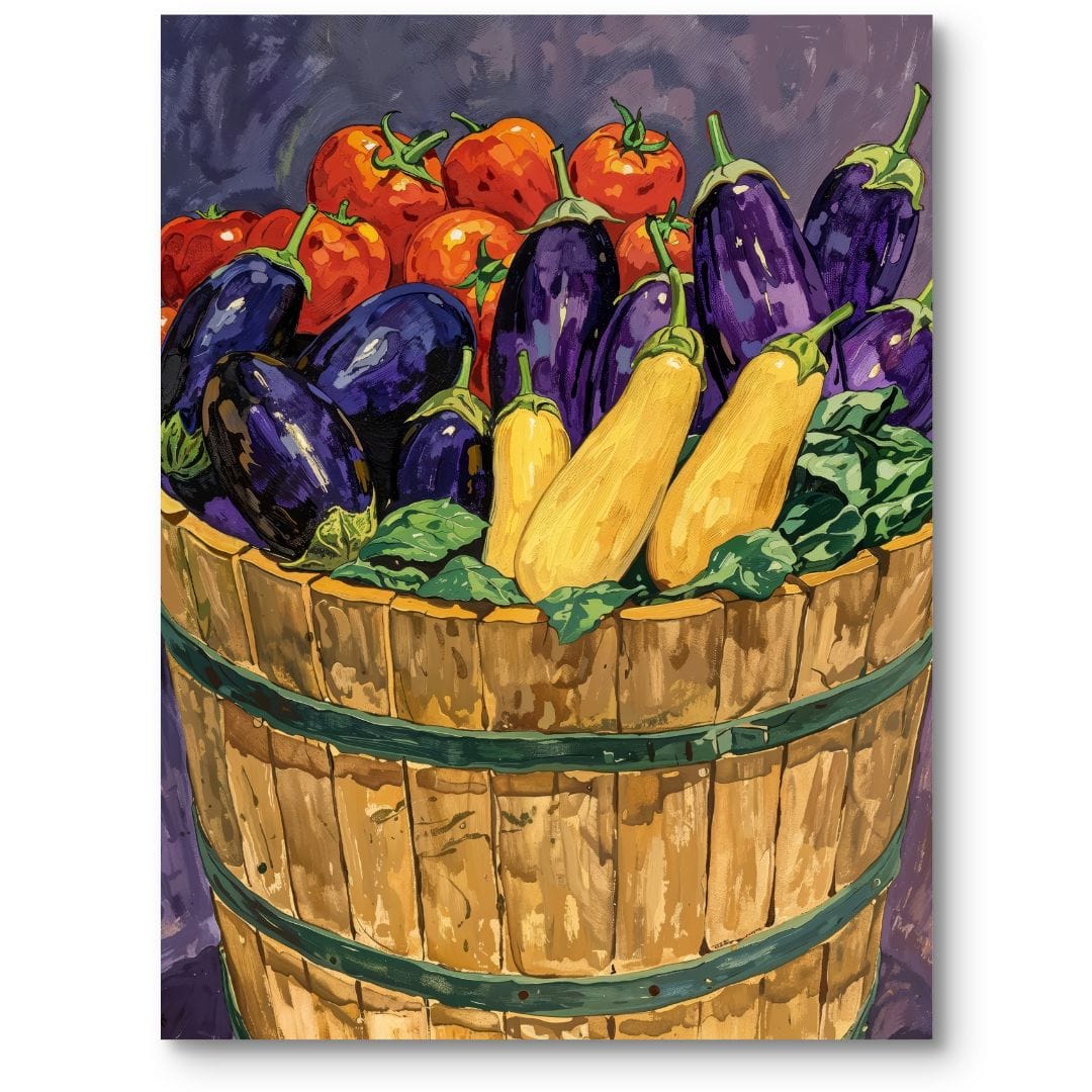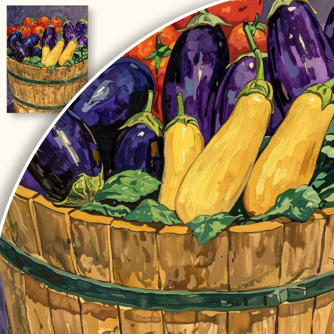 Scena skupia się na centralnej beczce, w której znajduje się bogactwo letnich warzyw. Dominujące fiolety i żółcie zostały doskonale zrównoważone zieleniami liści oraz stonowanym, neutralnym tłem. Naturalne światło podkreśla głębię oraz świeżość, dodając całemu obrazowi wyjątkowej lekkości.