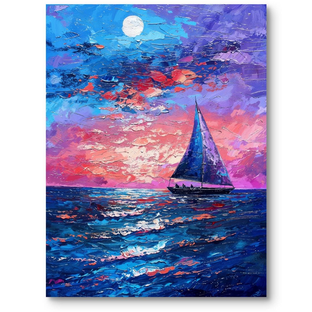 Obraz na płótnie ukazuje urzekający morski krajobraz z żaglówką kołyszącą się na łagodnych falach. Pierwszy plan zajmuje elegancka żaglówka, która spokojnie dryfuje po tafli wody. W tle rozpościera się barwne, pełne ekspresji niebo, które podkreśla magię wieczoru nad morzem. Delikatnie rozświetlone fale i subtelne refleksy światła odbijające się od powierzchni tworzą zapierający dech efekt głębi i realizmu.