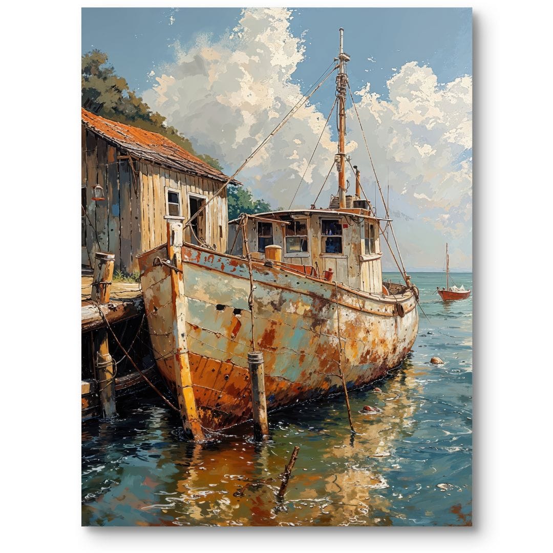 Obraz na płótnie przedstawia starą, zardzewiałą łódź rybacką, spokojnie zacumowaną przy drewnianym nabrzeżu. W tle rozciąga się błękitna, spokojna tafla wody, nad którą unoszą się delikatne, białe chmury na pogodnym niebie. W oddali widoczna jest kolejna łódź, która dodaje kompozycji subtelnej nuty nostalgii i refleksji. Całość tworzy atmosferę ciszy, spokoju oraz przemijającego piękna.