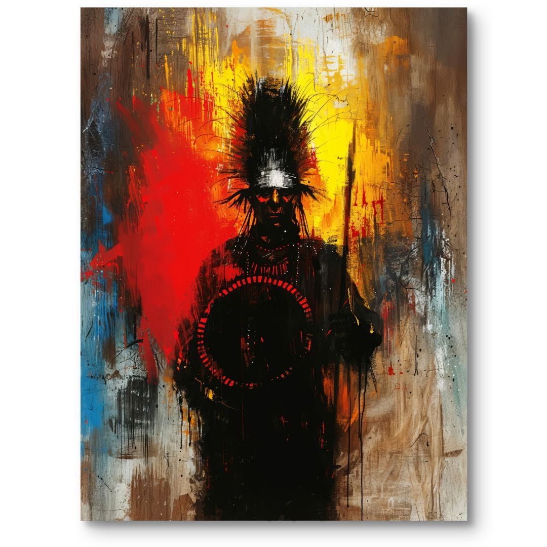 Obraz na płótnie ukazuje majestatyczną postać Indianina w ceremonialnym pióropuszu, trzymającego w dłoniach tajemniczy, symboliczny okrąg. Żywe czerwienie i żółcie eksplodują wokół niego, wzmacniając aurę rytualności i podkreślając mistyczny wymiar tej kompozycji.