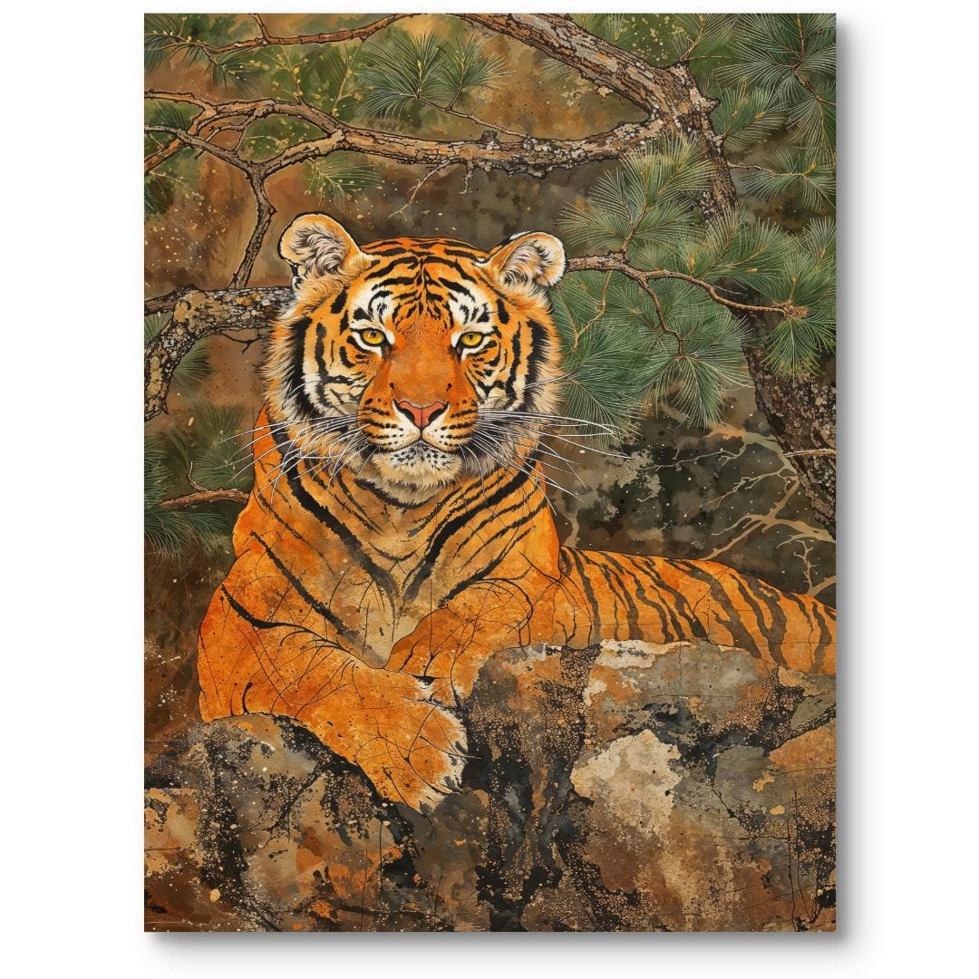 Obraz na płótnie przedstawia majestatycznego tygrysa w jego naturalnym środowisku. Realistycznie ukazane zwierzę siedzi wśród zielonych gałęzi i ziemistej scenerii, a precyzyjne odwzorowanie każdego szczegółu – od gęstego futra po strukturę drzew – oddaje niezwykłe piękno dzikiej przyrody. Tygrys jest tu symbolem nieokiełznanej siły, determinacji oraz odwagi, przez co obraz staje się wyjątkowo inspirującym akcentem dekoracyjnym.