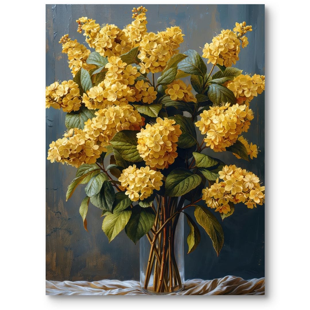 Ten obraz na płótnie ukazuje niezwykle malowniczy bukiet żółtych hortensji ustawionych w eleganckim wazonie. Każdy płatek i liść został oddany z niezwykłą starannością, co podkreśla autentyczność oraz urok tej kwiatowej kompozycji. Żywe, słoneczne kolory kwiatów wybijają się na tle harmonijnych odcieni błękitu i zieleni, sprawiając, że całość prezentuje się niczym prawdziwy, świeżo zerwany bukiet świecący w domowym wnętrzu.