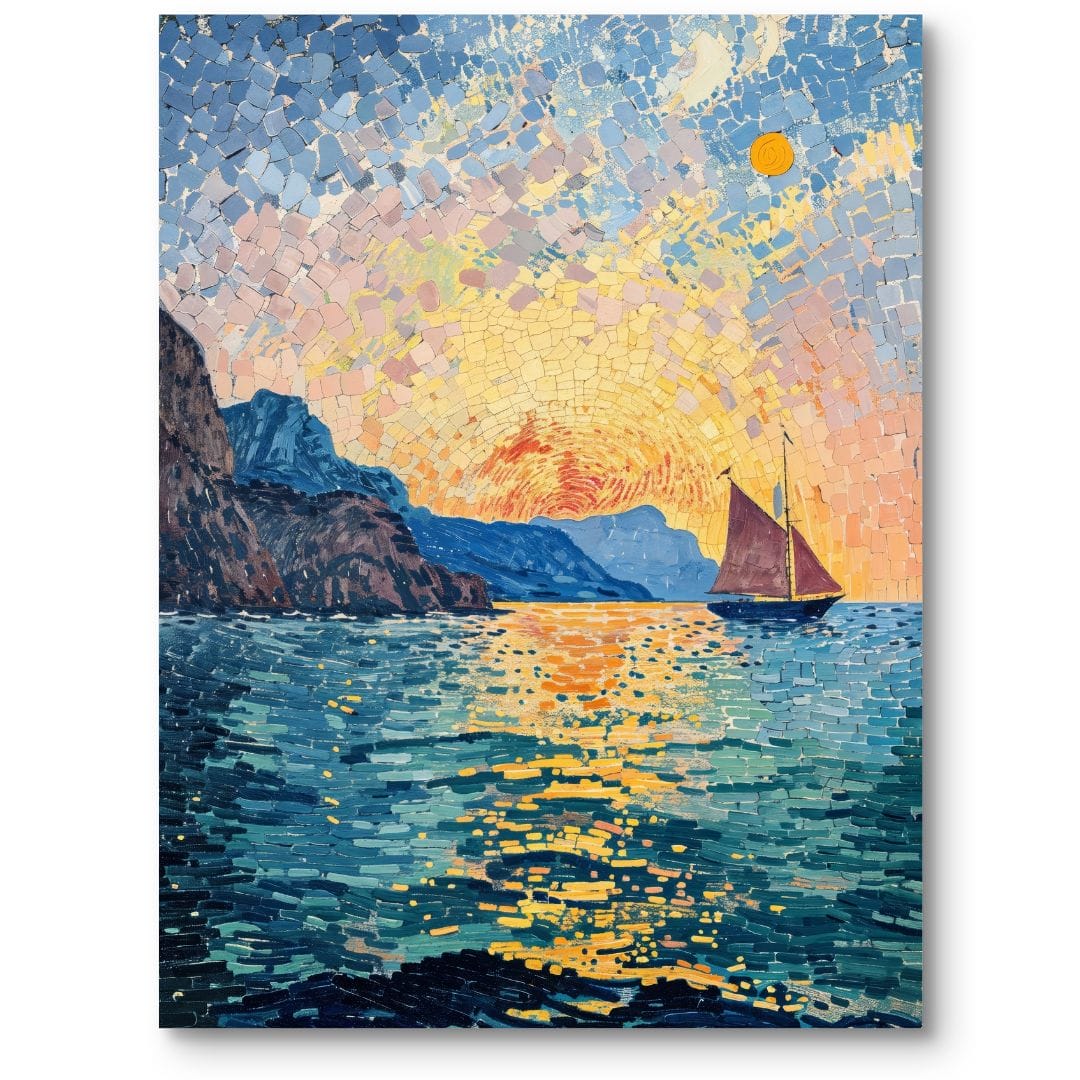 Obraz na płótnie ukazuje urzekający krajobraz morski z żaglówką zmierzającą ku zachodzącemu słońcu. W tle widoczne są majestatyczne góry oraz skaliste wybrzeże, a tafla wody odbija ciepłe odcienie zachodu. Kompozycja przyciąga wzrok, wprowadzając widza w nastrój spokojnej kontemplacji.