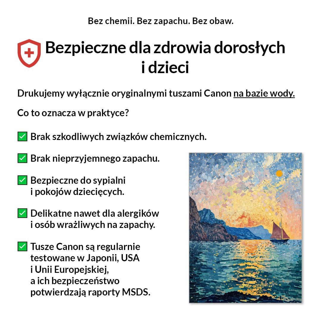 Tak, absolutnie! Drukujemy wyłącznie certyfikowanymi, bezwonnymi tuszami pigmentowymi Canon Lucia Pro na bazie wody. Są one w pełni bezpieczne dla zdrowia, nie zawierają rozpuszczalników i mogą być bez obaw stosowane w sypialniach i pokojach dziecięcych.