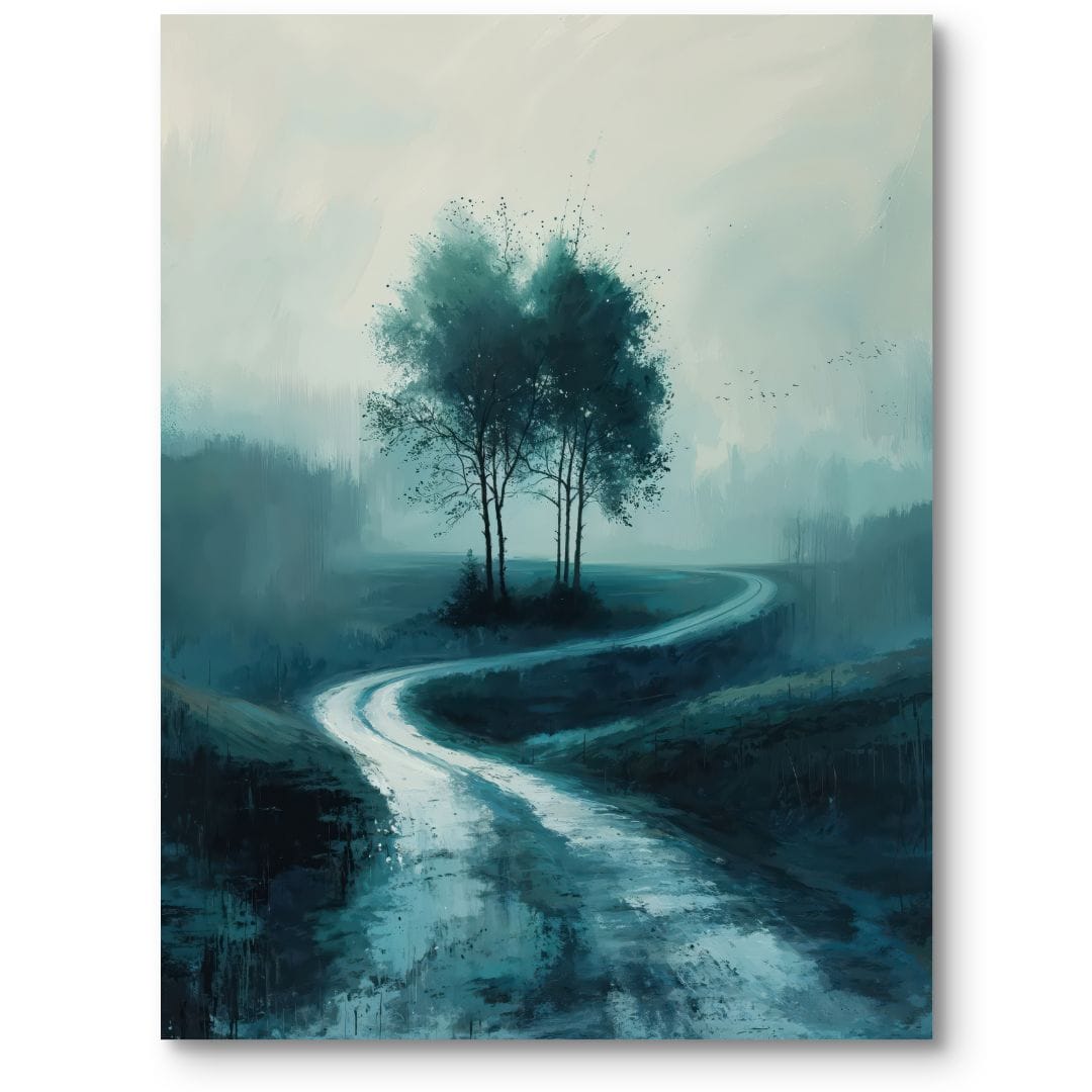Obraz wyróżnia się zrównoważoną kompozycją – esowata droga prowadzi wzrok ku centralnym drzewom. Subtelne, rozproszone światło wydobywa chłodne odcienie błękitów i zieleni, tworząc malowniczy, niemal eteryczny klimat. Kontrast jasnej ścieżki z ciemniejszym tłem dodatkowo wzmacnia dynamikę pracy i przyciąga uwagę odbiorcy.