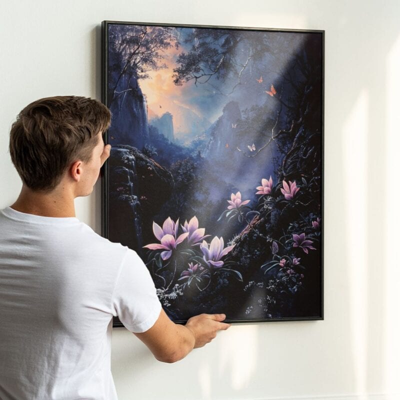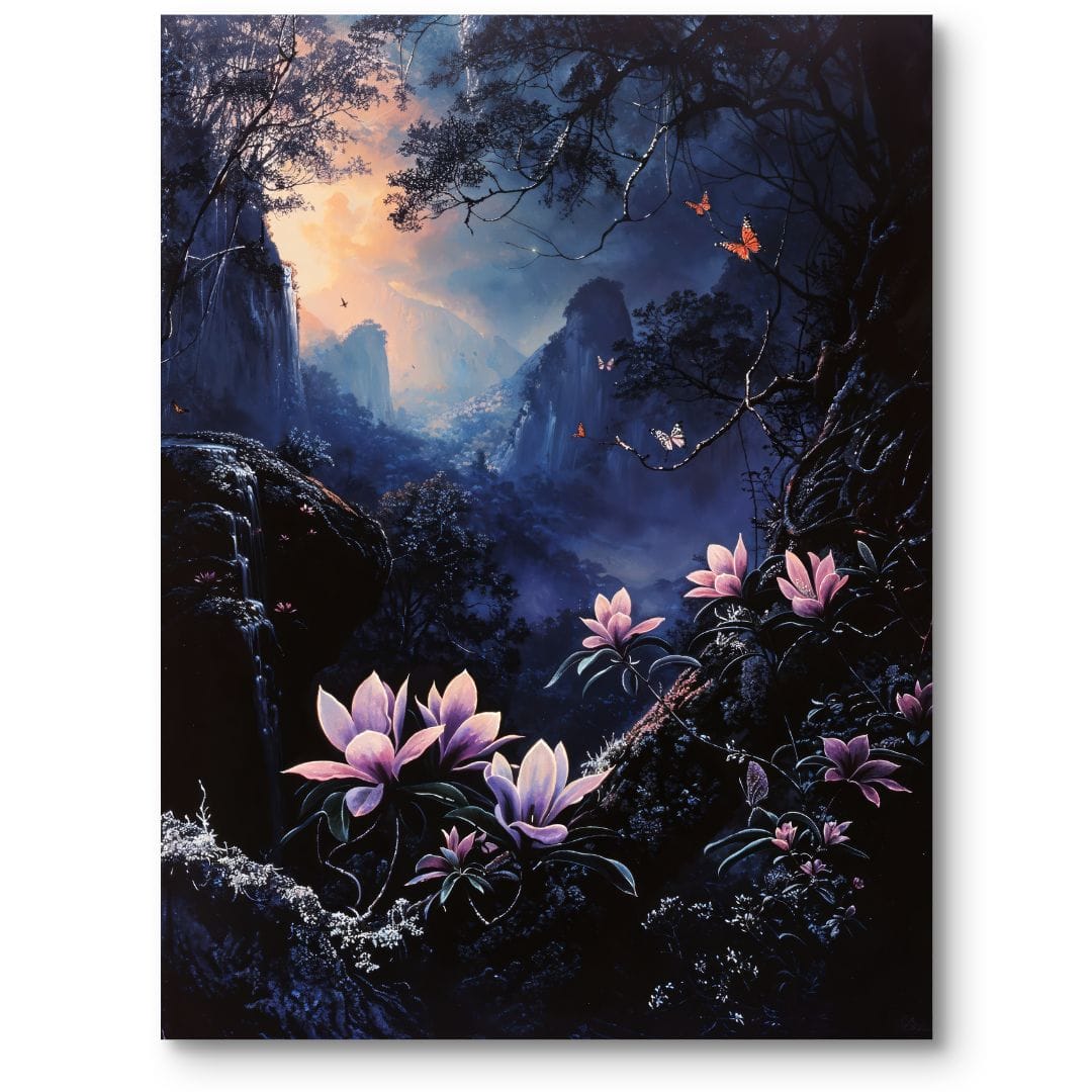 Obraz na płótnie przenosi nas w mistyczny, górski krajobraz otulony tajemniczą, pełną magii atmosferą. Na pierwszym planie rozkwitają olśniewające magnolie, a w ich otoczeniu wirują subtelne motyle. Tło stanowią majestatyczne góry, spowite surowym, a zarazem malowniczym pejzażem. Zauważalna ścieżka prowadzi przez mroczny las, zachęcając widza do wkroczenia w świat pełen niewypowiedzianych sekretów.