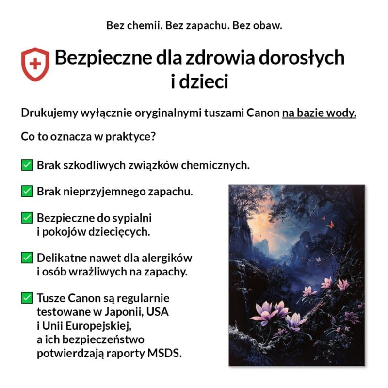 My drukujemy wyłącznie na pigmentowych tuszach Canon LUCIA PRO, bezpiecznych, bezzapachowych i certyfikowanych.