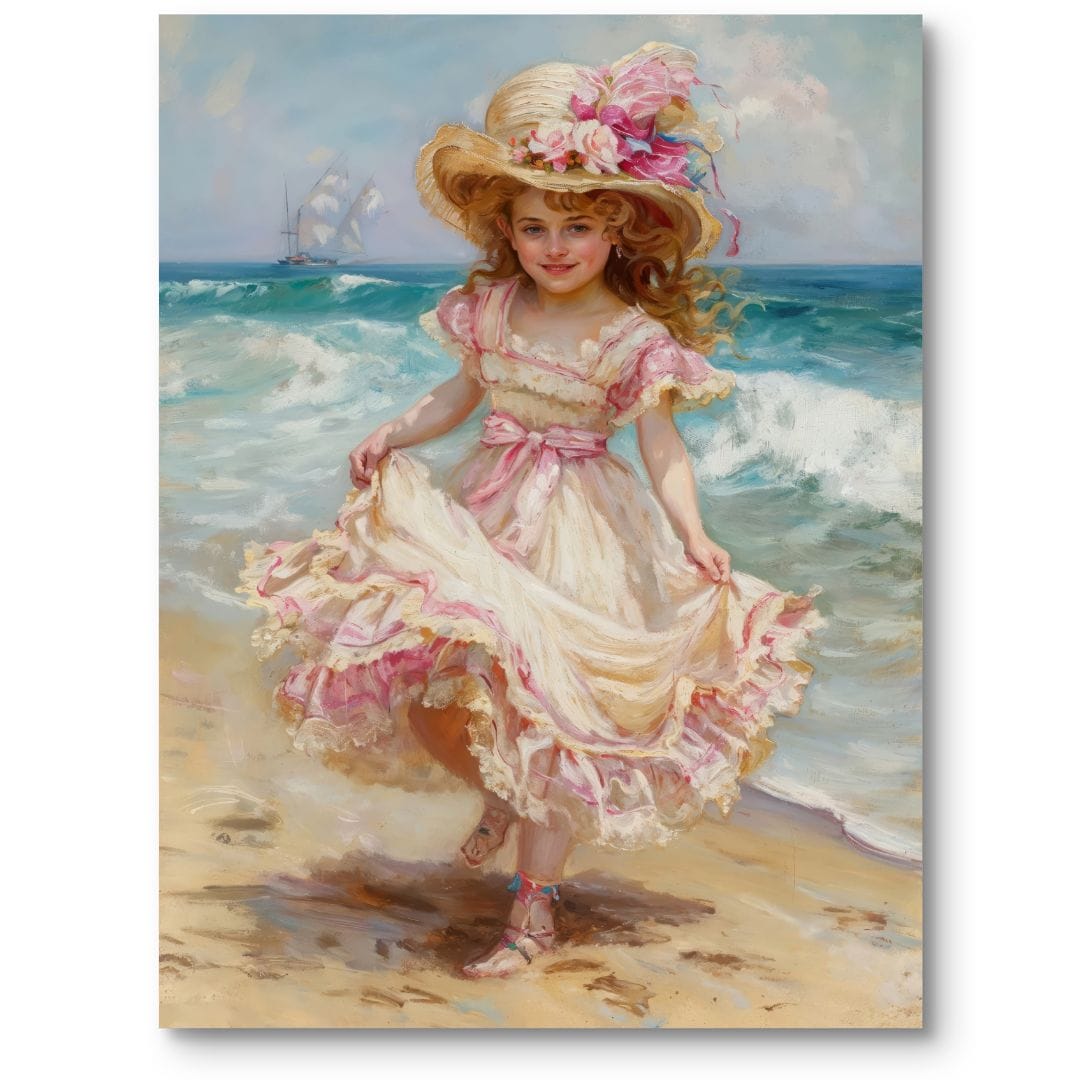 Obraz na płótnie ukazuje dziewczynkę, która spaceruje brzegiem plaży. Ubrana w elegancką sukienkę w odcieniach bieli i różu, emanuje urokiem i dziecięcą beztroską. Tło tej sceny wypełnia spokojne, błękitne morze oraz delikatnie widoczny żaglowiec, który nadaje kompozycji wyjątkowego uroku i atmosfery letniej przygody.
