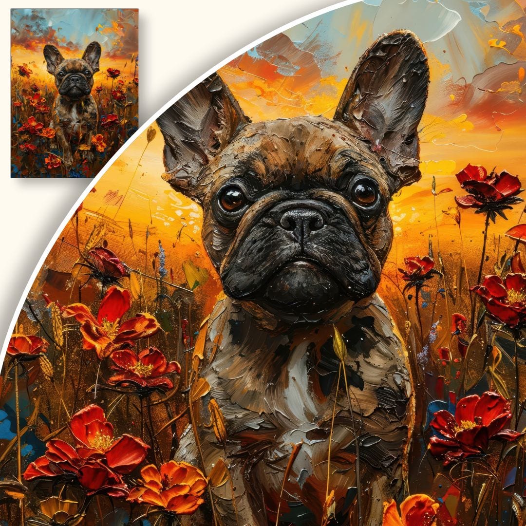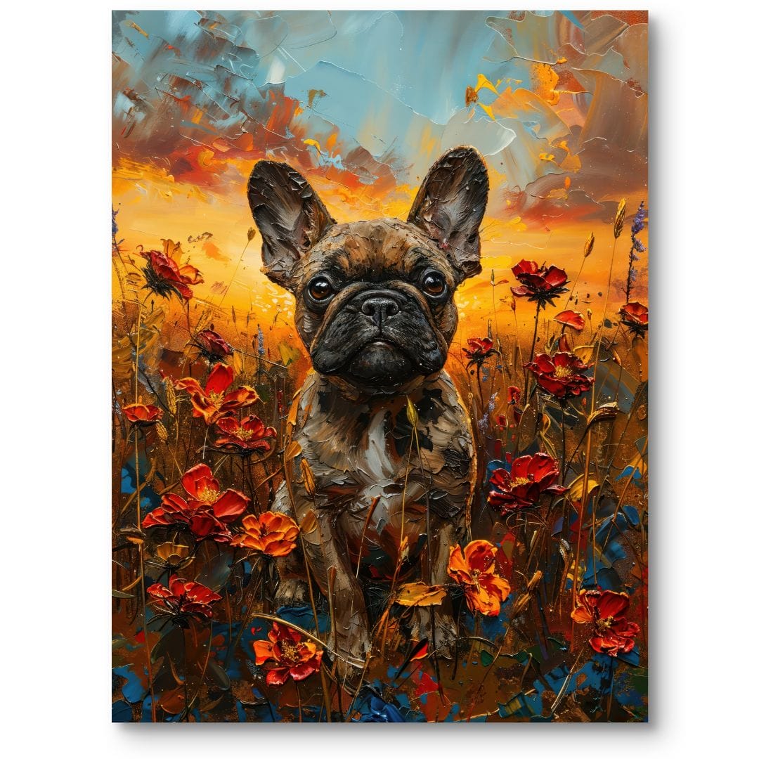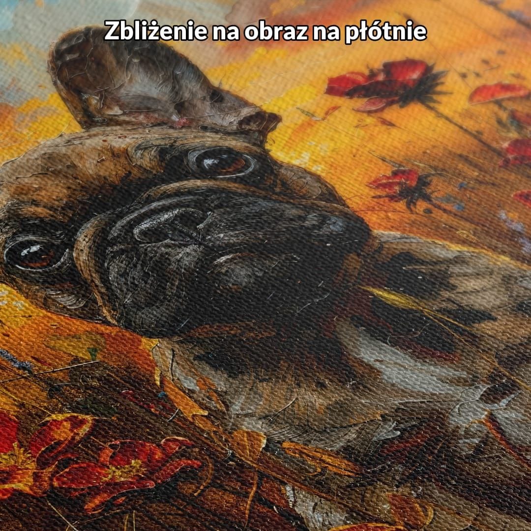 Obraz na płótnie ukazuje uroczego buldoga francuskiego, który z gracją zasiada wśród rozkwitającego, barwnego pola kwiatów o zachodzie słońca. Intensywna kolorystyka i rozmarzone spojrzenie psa budują ujmujące, pełne ciepła dzieło, które na długo pozostaje w pamięci.