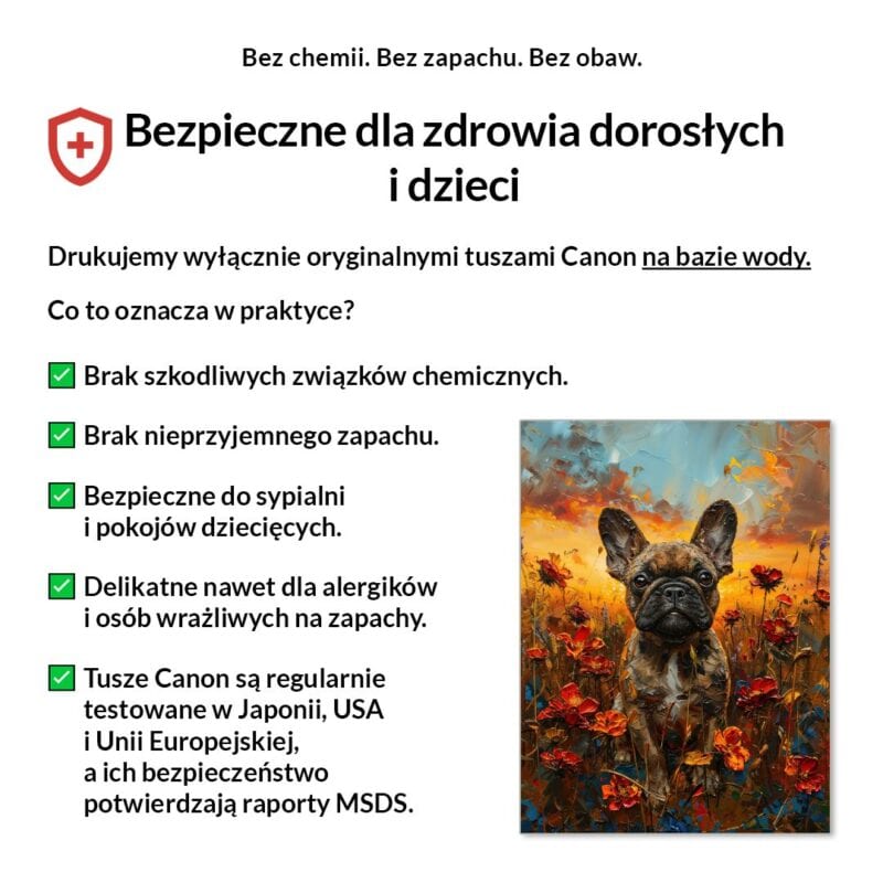 Tak, absolutnie! Drukujemy wyłącznie certyfikowanymi, bezwonnymi tuszami pigmentowymi Canon Lucia Pro na bazie wody. Są one w pełni bezpieczne dla zdrowia, nie zawierają rozpuszczalników i mogą być bez obaw stosowane w sypialniach i pokojach dziecięcych.