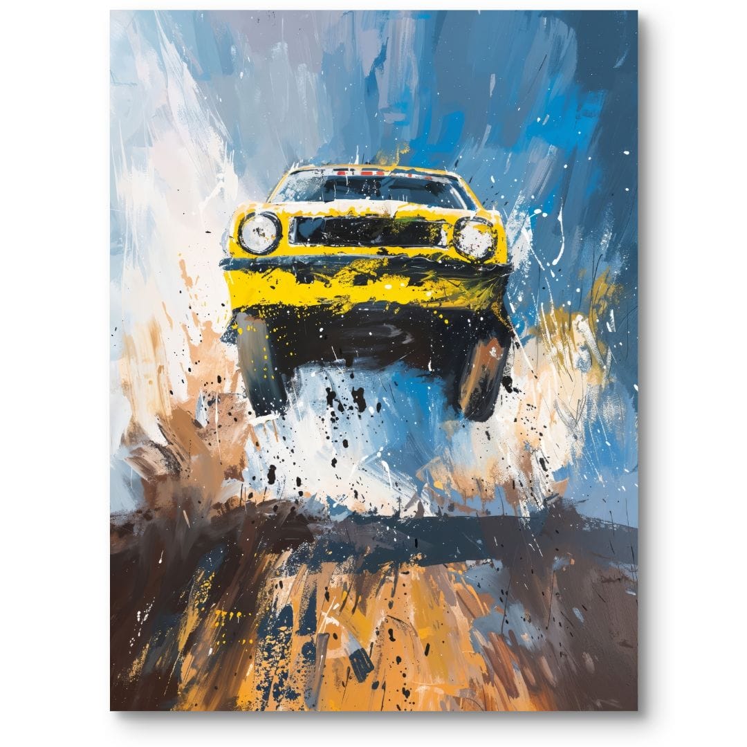 Ten obraz na płótnie ukazuje dynamiczny wyścig samochodowy, w którym soczyście żółty bolid przebija się na pierwszy plan, emanując niesamowitą energią. Rozmyty krajobraz w tle podkreśla zawrotną prędkość, a cała scena tętni adrenaliną, oddając prawdziwą atmosferę sportowych zmagań.