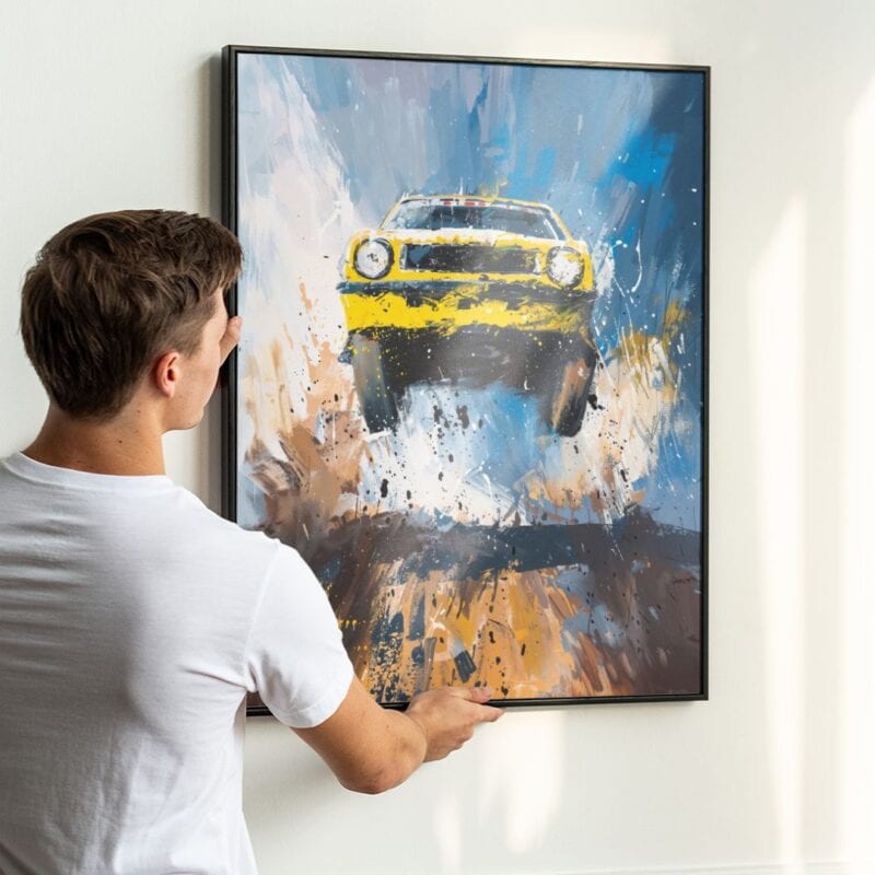 Obraz cechuje przemyślana kompozycja – dynamiczne linie diagonalne oraz wyrazista gra niebiesko-żółtych kontrastów wnoszą do wnętrza świeżość i ekspresję. Mocno zaakcentowane światło wydobywa detale pojazdu, dodając scenie dramatyzmu i energii.