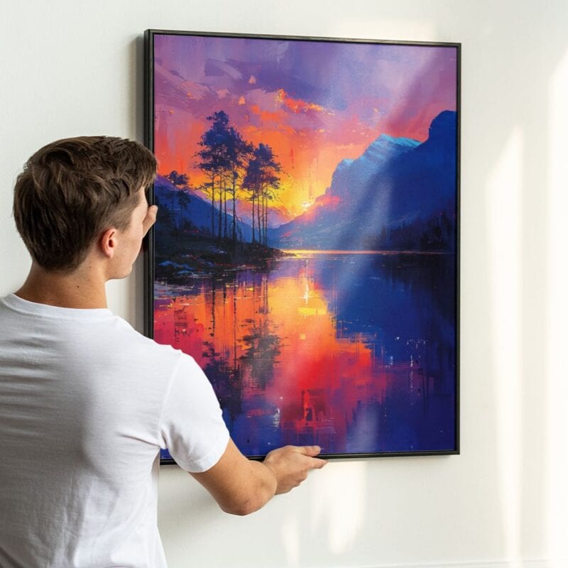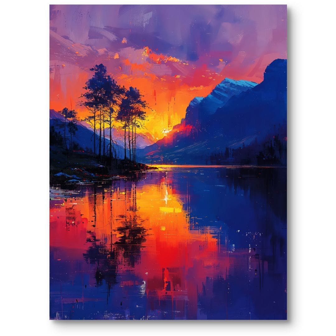 Obraz na płótnie przedstawia niezwykle malowniczy krajobraz górskiego jeziora podczas zachodu słońca. Tafla wody subtelnie odbija spektakularne, intensywne barwy nieba, tworząc niepowtarzalną harmonijną symfonię kolorów. Na pierwszym planie znajdują się smukłe, pełne wdzięku drzewa, które pogłębiają kompozycję i podkreślają sielski charakter dzieła.