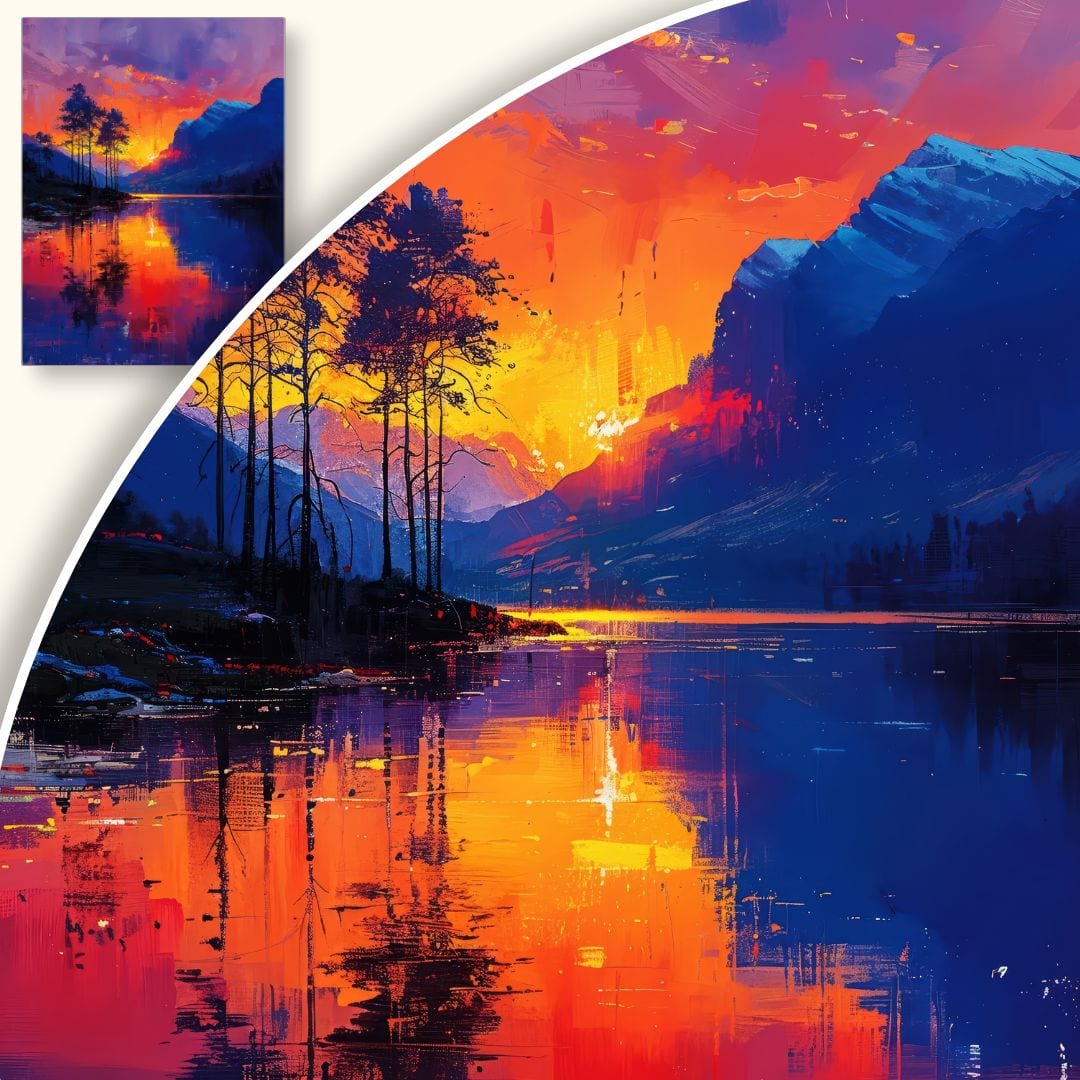 Kompozycja tego obrazu została starannie przemyślana – harmonijnie prowadzi wzrok przez wszystkie plany od pierwszego aż po majestatyczne góry w tle. Promienie zachodzącego słońca rozlewają się złocistym blaskiem po całym pejzażu, kontrastując z chłodnymi błękitami i fioletami tafli jeziora oraz sylwetek gór. Kolory są intensywne, dynamiczne, a jednocześnie subtelnie się przenikają – dominują pomarańcze, fiolety, turkusy i błękity.
