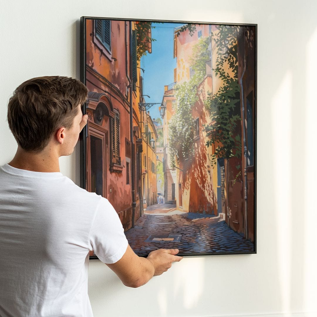 Dopracowana kompozycja wprowadza wzrok odbiorcy w głąb uliczki, budując poczucie autentycznej perspektywy i głębi. Kontrastujące ze sobą ciepłe barwy oraz soczysta zieleń roślin tworzą wysmakowaną harmonię pejzażu, a gra światła na fasadach budynków potęguje wrażenie letniego, beztroskiego dnia.
