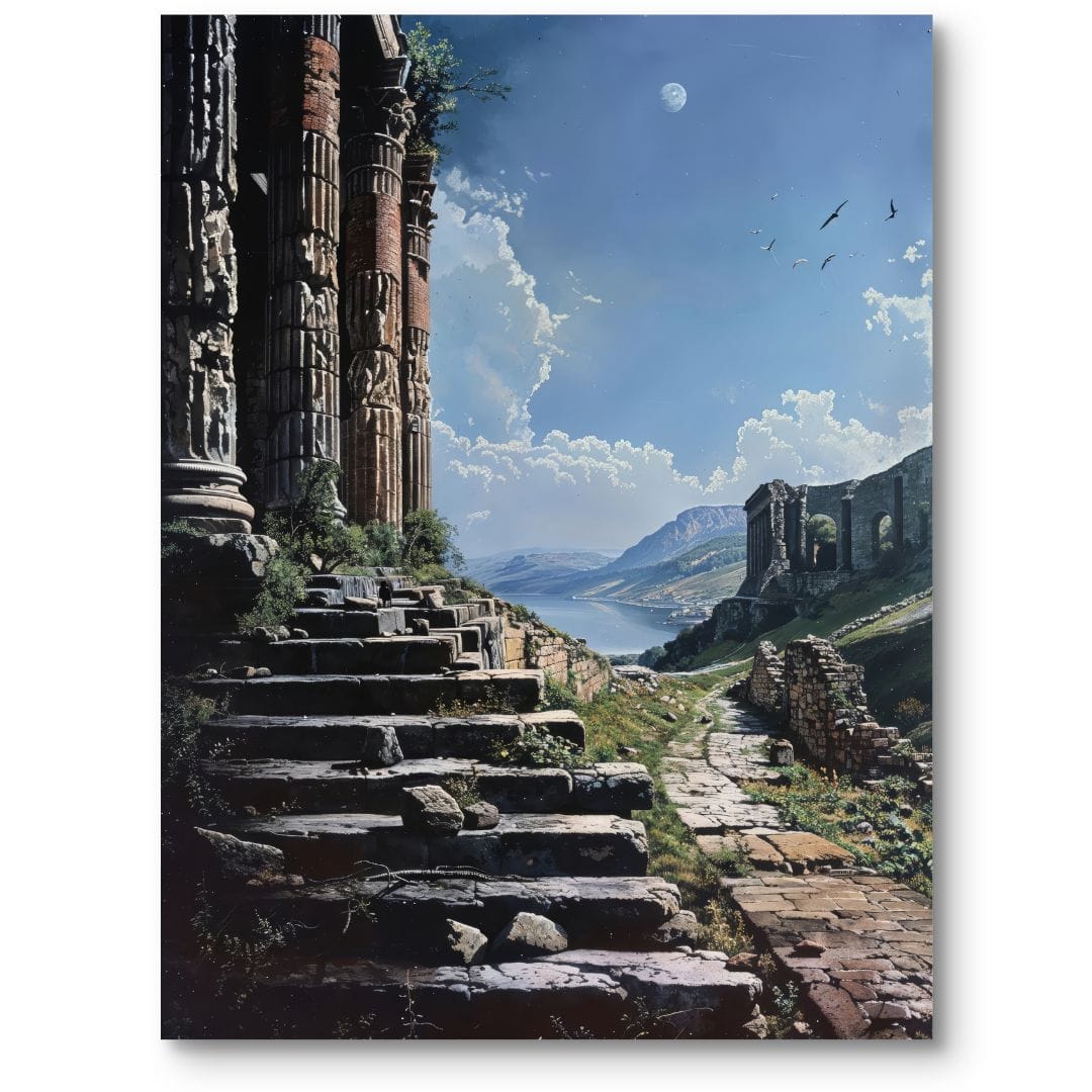 Obraz na płótnie przedstawia majestatyczne starożytne ruiny otulone malowniczym krajobrazem. Kompozycja ukazuje zniszczone schody prowadzące do fragmentów monumentalnych budowli, które stanowią wyrazisty kontrast dla zapierającego dech w piersiach panoramy gór i wijącej się rzeki. Przelatujące chmury i ptaki na tle nieba dodają dynamizmu, budując atmosferę ciszy oraz refleksyjnego spokoju pośród pozostałości minionej cywilizacji pochłoniętej przez naturę.