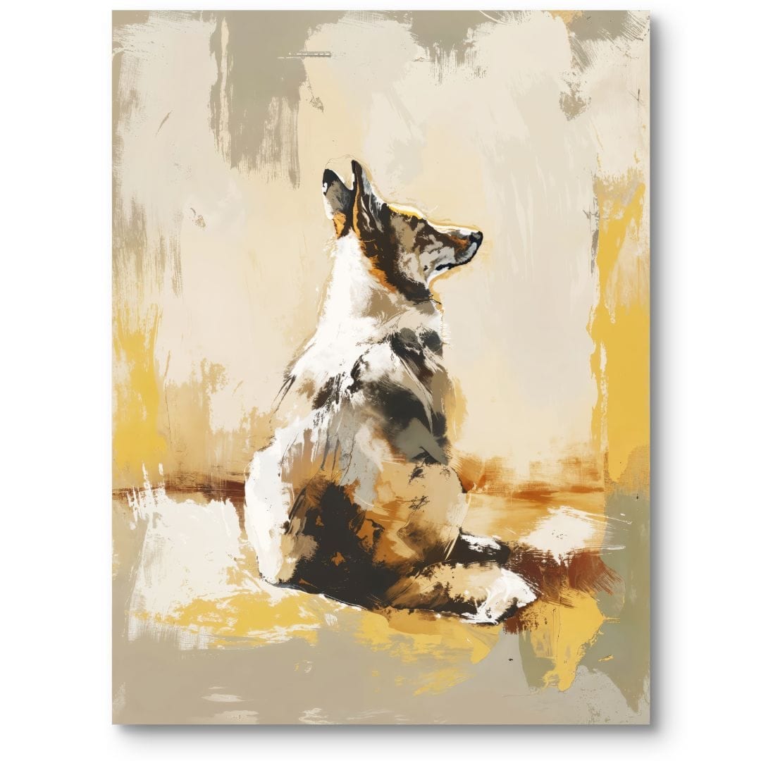Kompozycja obrazu została starannie wyważona, a postać psa, umieszczona centralnie, odcina się na tle jasnych, pogodnych barw. Delikatne światło i przewaga żółci, beżu oraz bieli tworzą przytulną atmosferę, zachęcając do wyciszenia i odpoczynku. Każdy detal, od cieniowania po miękkie kontury, podkreśla harmonię tej kompozycji.