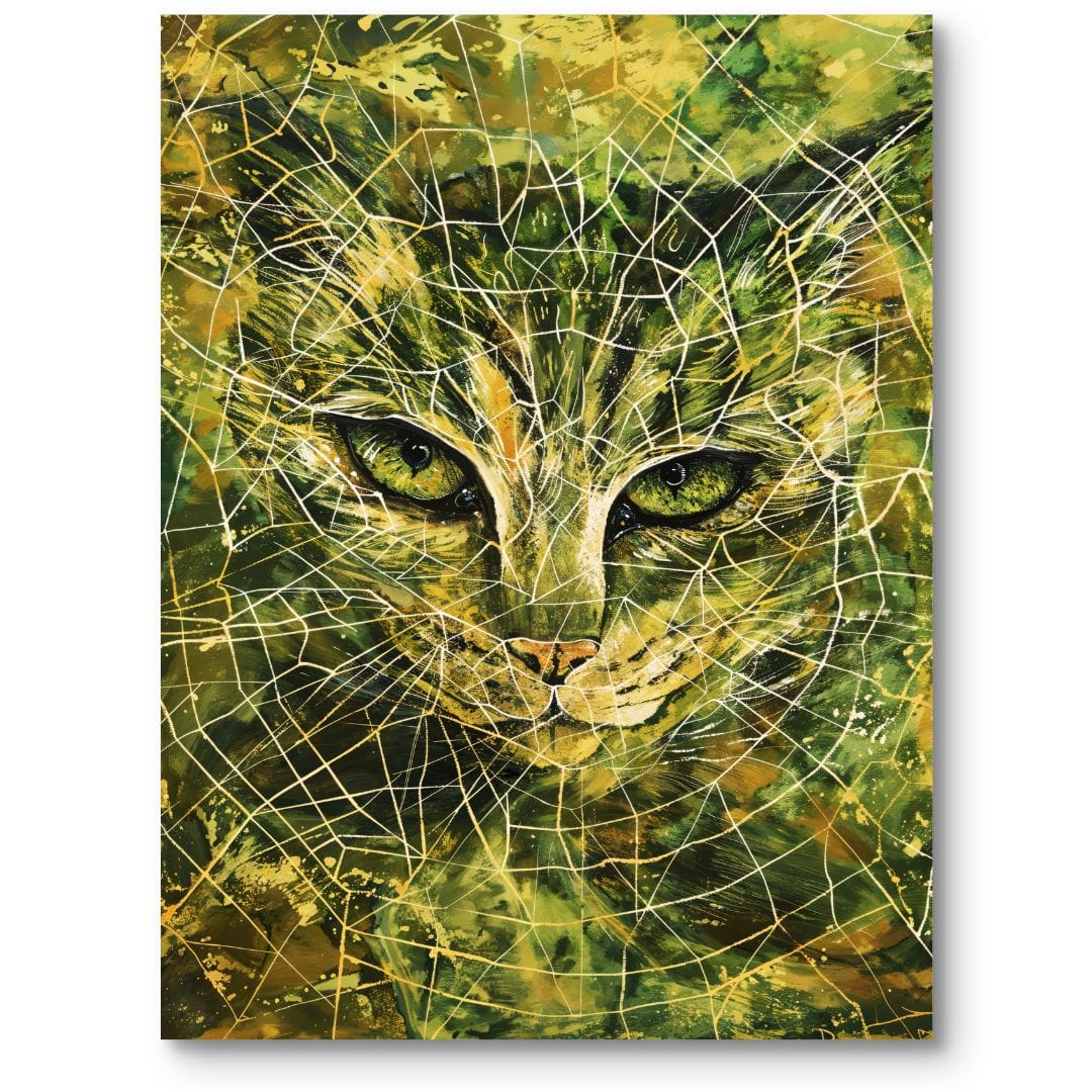 Prezentowany obraz ukazuje enigmatycznego kota o hipnotyzujących, zielonych oczach. Na pierwszy rzut oka widać, że zwierzę zostało uchwycone w centrum abstrakcyjnej sieci o pulsujących, żółtych liniach, budujących niezwykłą aurę tajemnicy i niejednoznaczności.