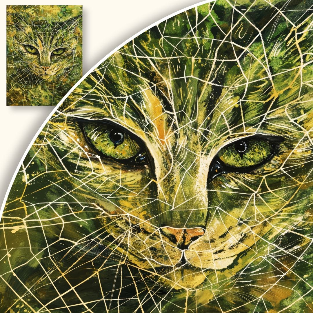 W obrazie przeważają odcienie zieleni i żółci, a każdy szczegół przyciąga spojrzenie bogactwem form. Odpowiednio rozłożone światło subtelnie akcentuje teksturę kociej sierści, podczas gdy energetyczne linie abstrakcyjnej sieci wzmacniają dynamikę i wyrazistość dzieła.