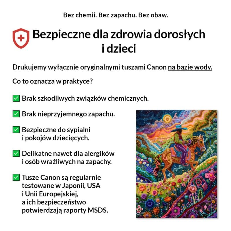 Tak, absolutnie! Drukujemy wyłącznie certyfikowanymi, bezwonnymi tuszami pigmentowymi Canon Lucia Pro na bazie wody. Są one w pełni bezpieczne dla zdrowia, nie zawierają rozpuszczalników i mogą być bez obaw stosowane w sypialniach i pokojach dziecięcych.