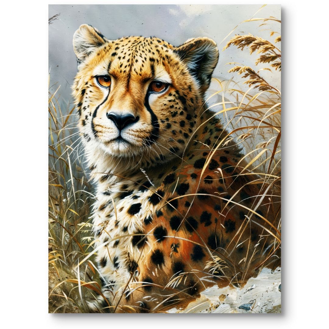 Obraz na płótnie ukazuje majestatycznego geparda w otoczeniu bujnej, dzikiej roślinności sawanny. Artysta z niezwykłą precyzją i realizmem uchwycił nie tylko wygląd zwierzęcia, ale też atmosferę jego naturalnego środowiska. Gepard, z charakterystycznymi plamami na złocisto-brązowej sierści oraz zgrabną, dynamiczną sylwetką, staje się centralnym bohaterem dzieła. Tło prezentuje delikatnie kołyszące się trawy sawanny, które dodają obrazu lekkości i ruchu, podkreślając dzikość i wolność afrykańskiej przyrody.
