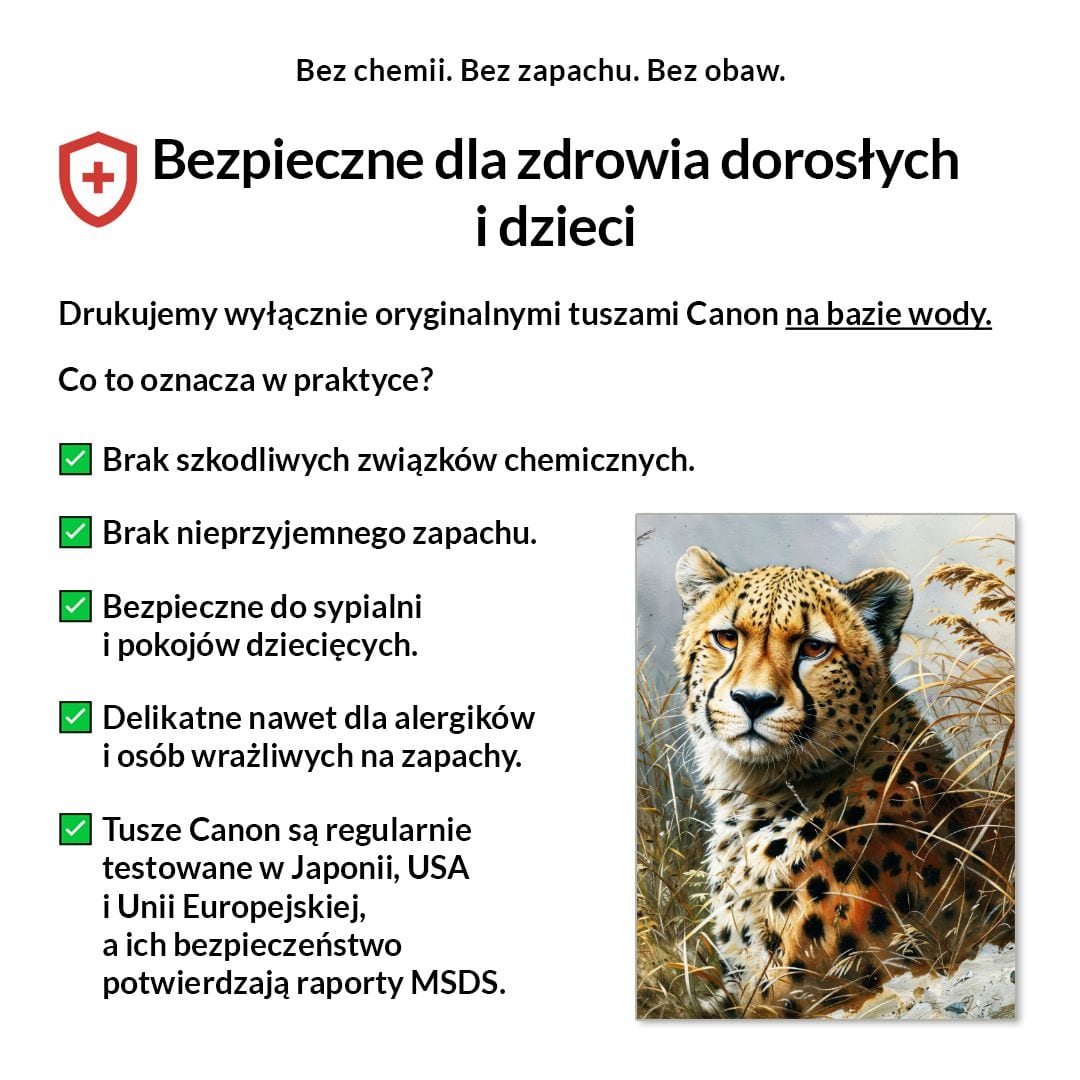 Tak, absolutnie! Drukujemy wyłącznie certyfikowanymi, bezwonnymi tuszami pigmentowymi Canon Lucia Pro na bazie wody. Są one w pełni bezpieczne dla zdrowia, nie zawierają rozpuszczalników i mogą być bez obaw stosowane w sypialniach i pokojach dziecięcych.