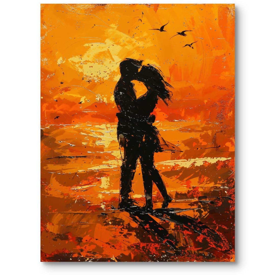 Obraz na płótnie ukazuje romantyczny zachód słońca, w którym centralną rolę odgrywa para zakochanych obejmująca się w ciepłym, pomarańczowo-złotym świetle. Subtelne, rozgrzane promienie słoneczne tworzą wokół nich magiczną aurę pełną miłości i harmonii. W tle delikatnie zarysowane fale morza oraz szybujące ptaki dodają kompozycji lekkości i naturalnej dynamiki.