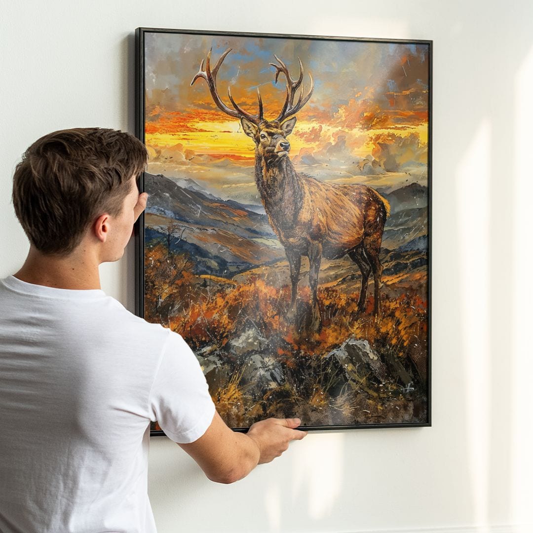 Obraz na płótnie ukazuje majestatycznego jelenia, który z dumą spogląda przed siebie, stojąc pośród malowniczego górskiego krajobrazu oświetlonego ciepłym blaskiem zachodzącego słońca. Ta wyjątkowa scena uchwyca dzikość natury oraz magię chwil, które codziennie przemijają niezauważone. Jeleń, otoczony surowymi, skalistymi zboczami, emanuje spokojem i siłą, oddając piękno nieujarzmionej przyrody.