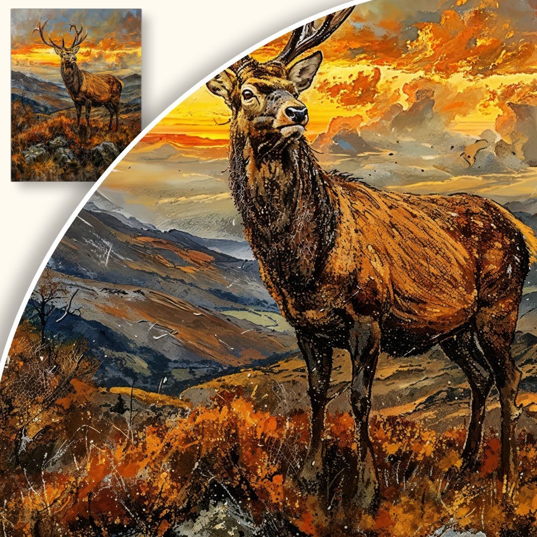 Kompozycja wyróżnia się harmonijnym rozmieszczeniem elementów – centralnie umieszczony jeleń przyciąga wzrok, a tło dopełniają kontrastowe barwy zachodzącego słońca oraz chłodne odcienie gór. Subtelne refleksy światła grają na sierści jelenia i szczytach, podkreślając grę między ciepłymi pomarańczami a szarościami skał. Całość tworzy spójną i naturalną paletę kolorystyczną.