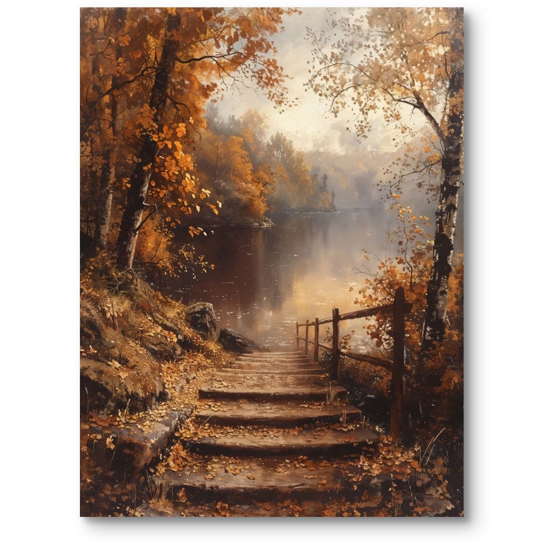 Obraz ukazuje malowniczą ścieżkę z drewnianych schodków schodzących ku cichej,