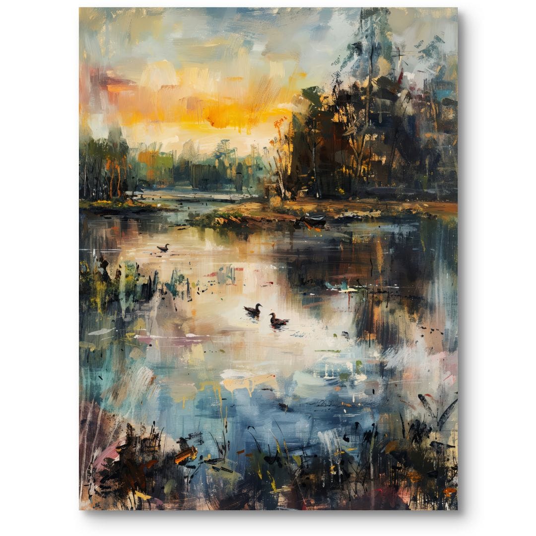 Obraz na płótnie ukazuje urokliwy krajobraz nad jeziorem, otulony gęstą roślinnością i majestatycznym lasem. W centrum kompozycji dwie kaczki, sunące leniwie po tafli wody, wnoszą do sceny nutę życia i naturalnej swobody. Na horyzoncie spektakularny zachód słońca rozświetla niebo feerią pomarańczowych, różowych oraz błękitnych tonów, przenosząc widza w harmonijny świat dzikiej przyrody.