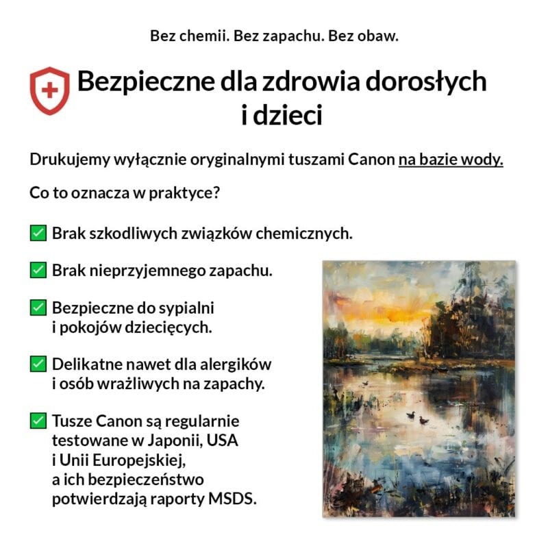 Tak, absolutnie! Drukujemy wyłącznie certyfikowanymi, bezwonnymi tuszami pigmentowymi Canon Lucia Pro na bazie wody. Są one w pełni bezpieczne dla zdrowia, nie zawierają rozpuszczalników i mogą być bez obaw stosowane w sypialniach i pokojach dziecięcych.