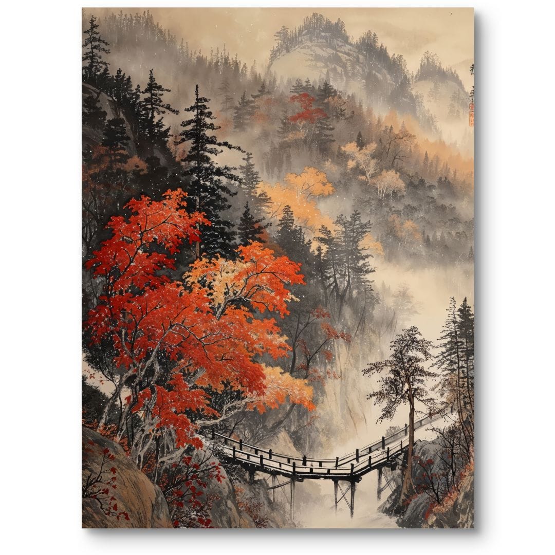 Ten wyjątkowy obraz na płótnie przenosi nas w serce jesiennego krajobrazu, gdzie drewniany most rozciąga się malowniczo nad spokojną rzeką. Górskie wzgórza toną w lekkiej mgle, a porastające je lasy pełne są intensywnie czerwonych liści, tworząc niezwykle przytulny, ciepły akcent w kompozycji. Centralnie umieszczony most nadaje dziełu głębi i symbolizuje drogę, która łączy nie tylko brzegi, ale i codzienne życiowe doświadczenia.