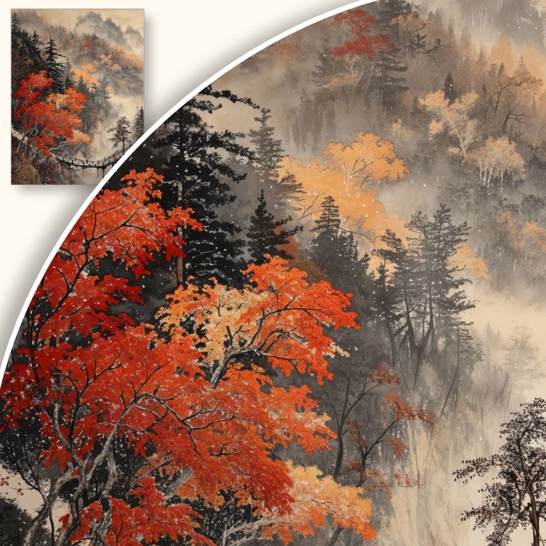Mistrzowsko zbalansowana kompozycja prowadzi wzrok ku mostowi, stanowiącemu oś centralną dzieła. Rozproszone, miękkie światło wprowadza tajemniczość i aurę magii, podkreślaną przez kontrasty między szarością gór i mgły a ognistą czerwienią liści. Efekt końcowy emanuje harmonią i głębokim nastrojem.
