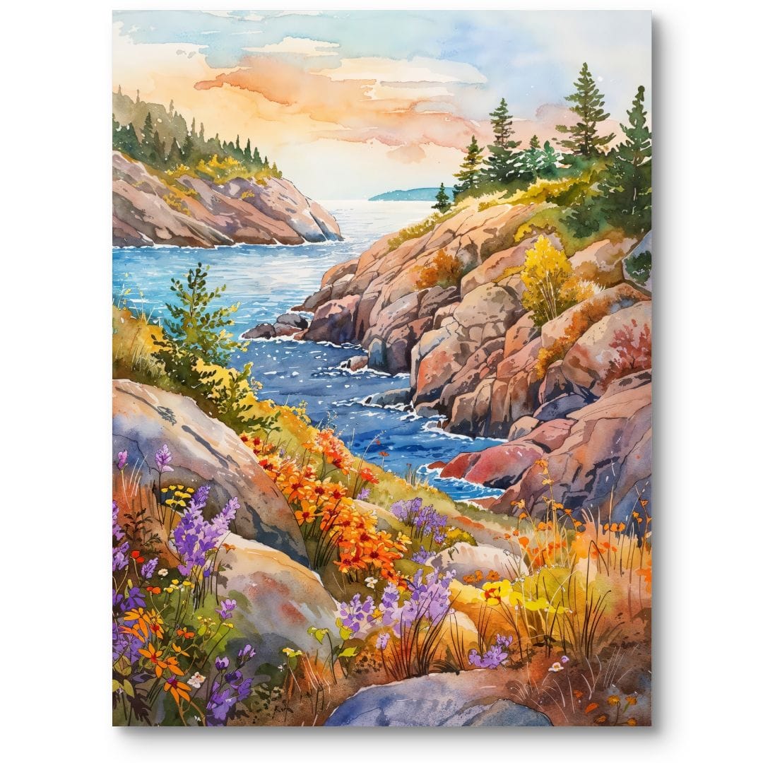 Zharmonizowana kompozycja prowadzi wzrok od wielobarwnych kwiatów na pierwszym planie aż po rozległe, spokojne morze i daleki horyzont. Obraz zachwyca ciepłym światłem poranka lub wieczoru, gdzie pomarańczowe tony współgrają z ochładzającym błękitem i soczystą zielenią, wprowadzając równowagę i ukojenie.