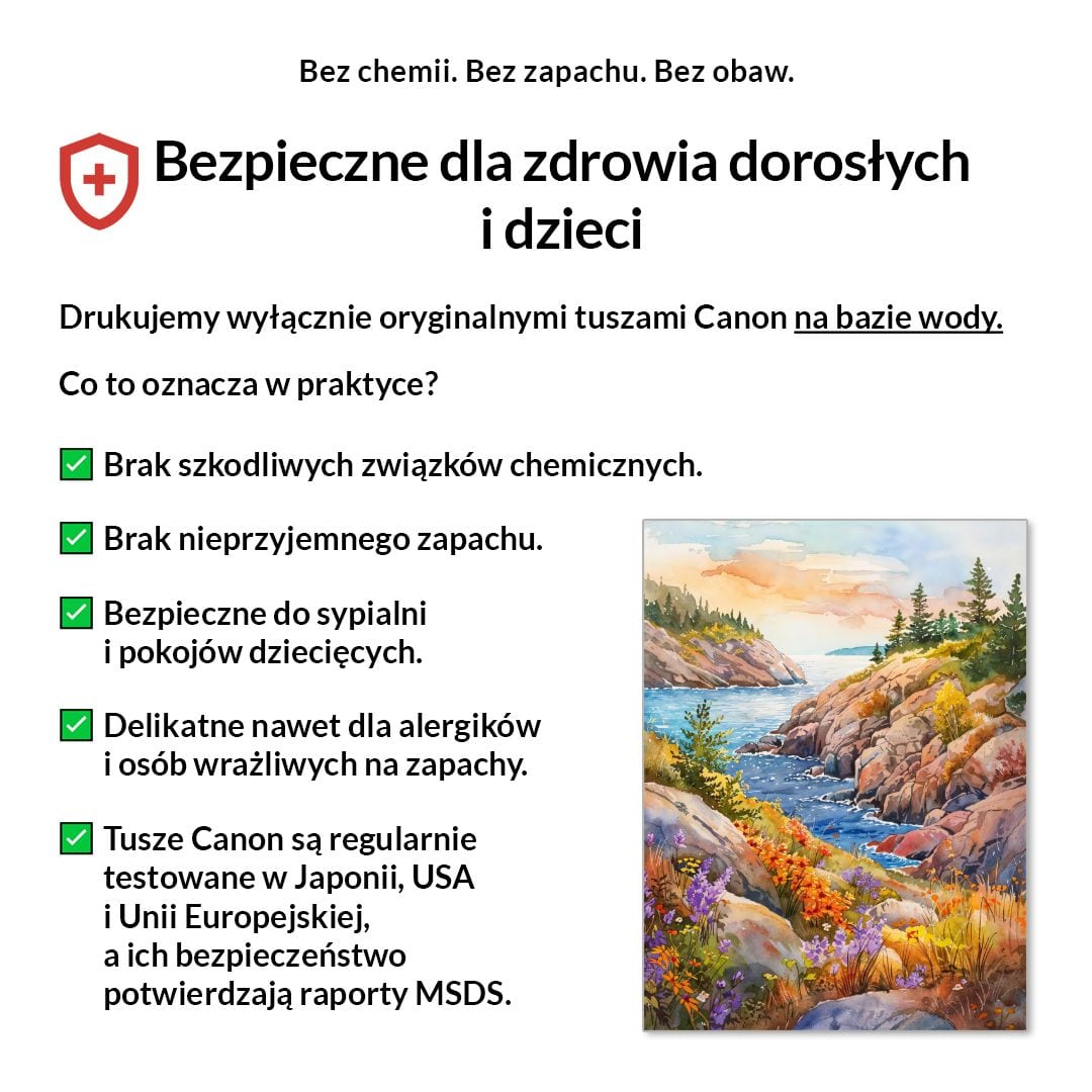 Tak, absolutnie! Drukujemy wyłącznie certyfikowanymi, bezwonnymi tuszami pigmentowymi Canon Lucia Pro na bazie wody. Są one w pełni bezpieczne dla zdrowia, nie zawierają rozpuszczalników i mogą być bez obaw stosowane w sypialniach i pokojach dziecięcych.
