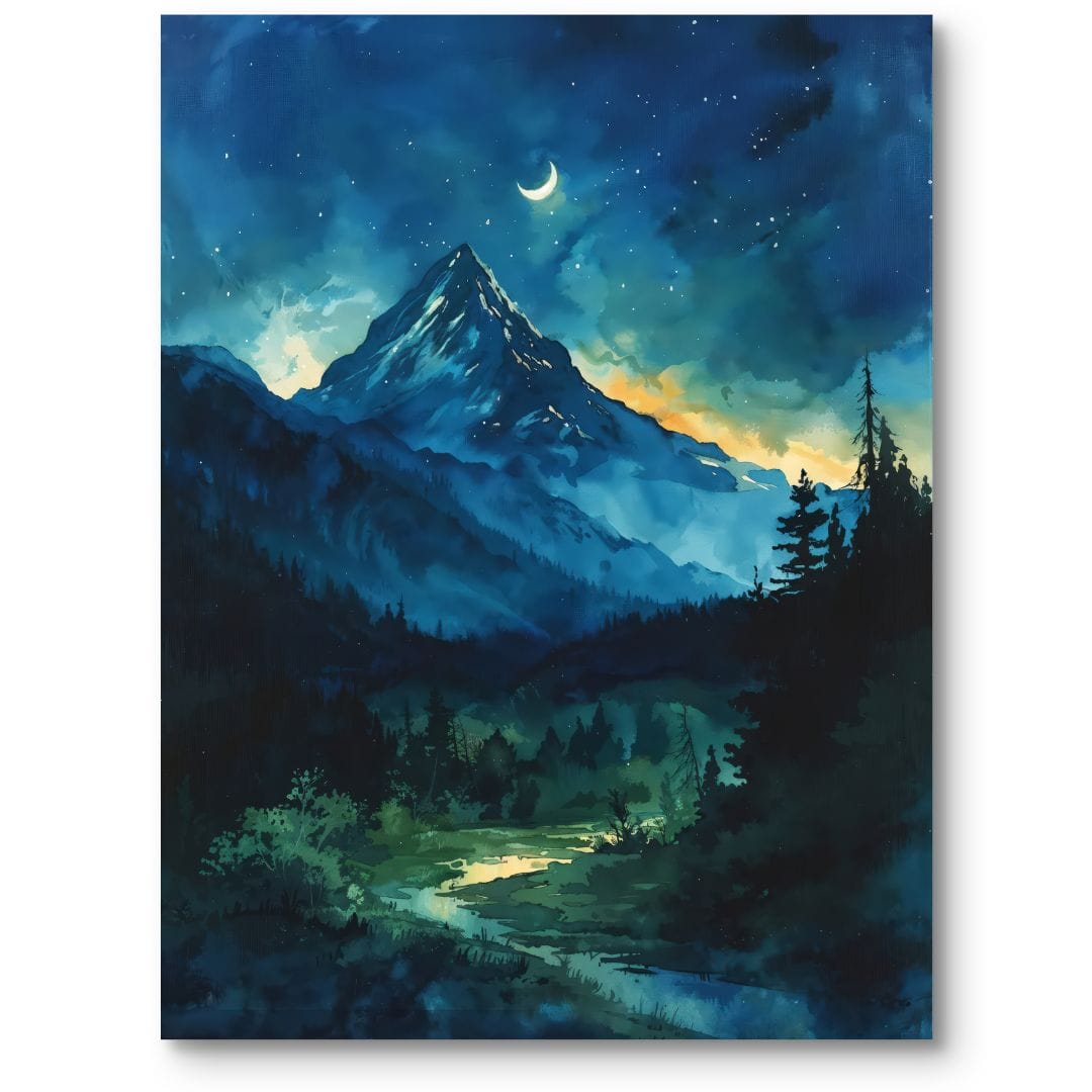 Obraz na płótnie ukazuje malowniczy, nocny pejzaż z majestatyczną górą dominującą w tle. Zawieszony na aksamitnym niebie półksiężyc roztacza wokół siebie aurę magii, a rzeka wijąca się przez zielone doliny, wśród delikatnych konturów drzew, wprowadza element tajemniczości i ukojenia.