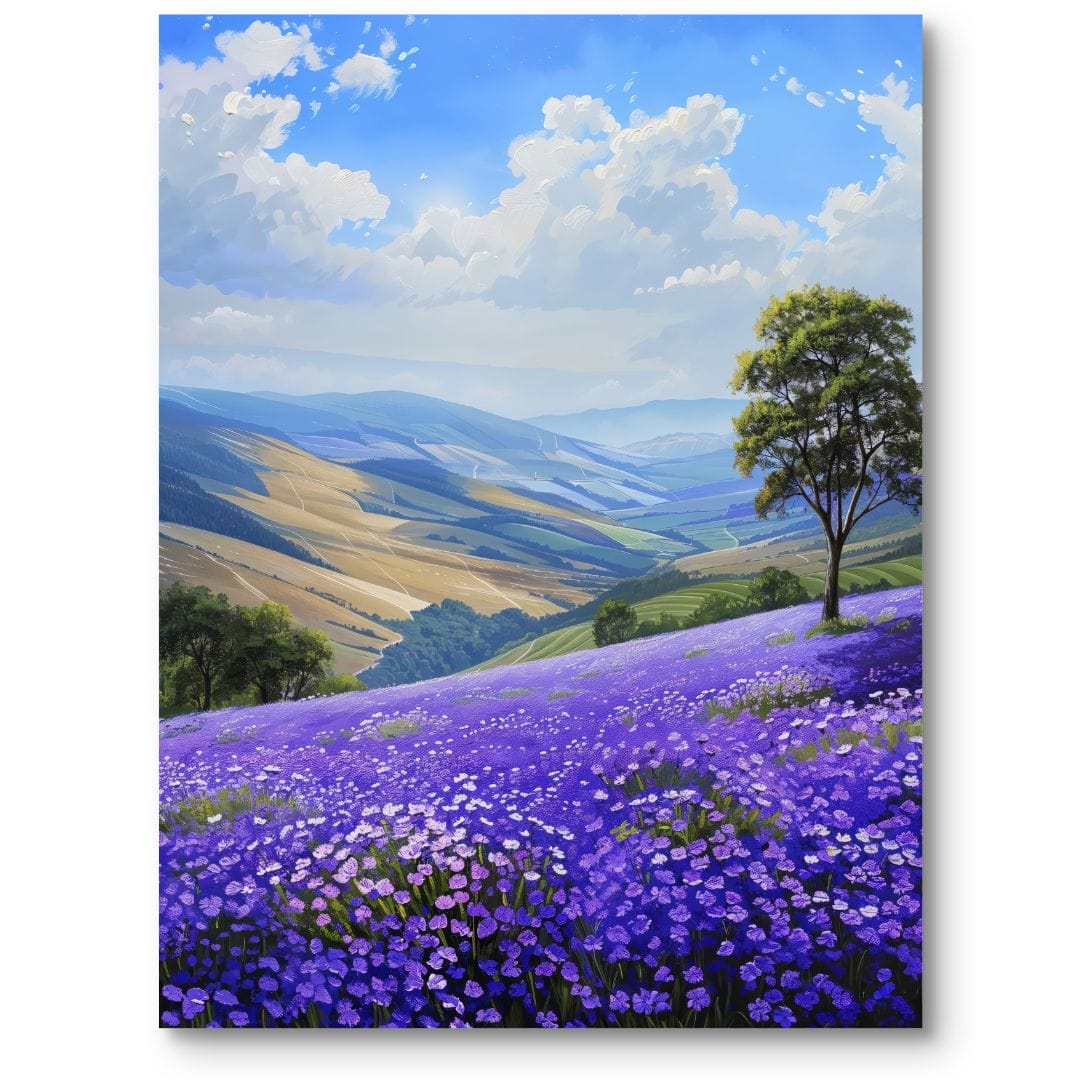 Obraz na płótnie ukazuje malowniczy krajobraz rozległej, fioletowej łąki udekorowanej dzikimi kwiatami. W tle majestatycznie rozpościerają się łagodne wzgórza i majestatyczne góry, nad którymi króluje błękitne niebo z puszystymi białymi chmurami. Kompozycję dopełniają spokojnie stojące drzewa, nadając całemu pejzażowi wyjątkową harmonię i naturalność.