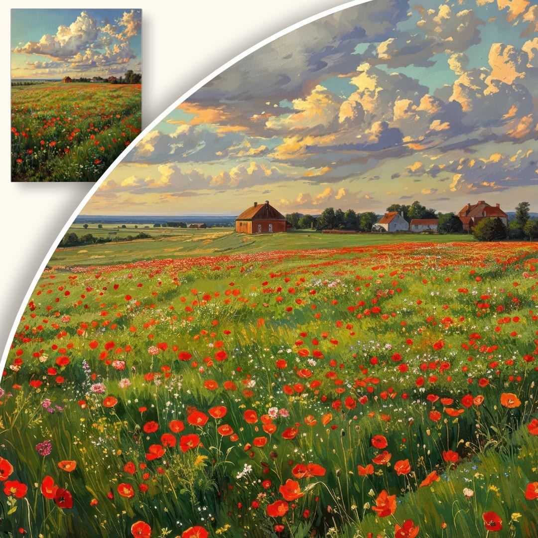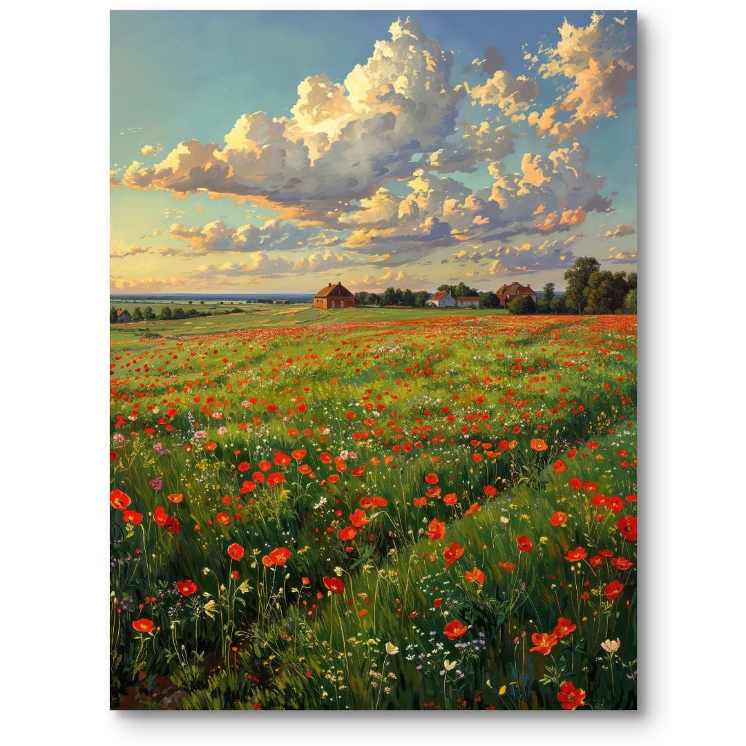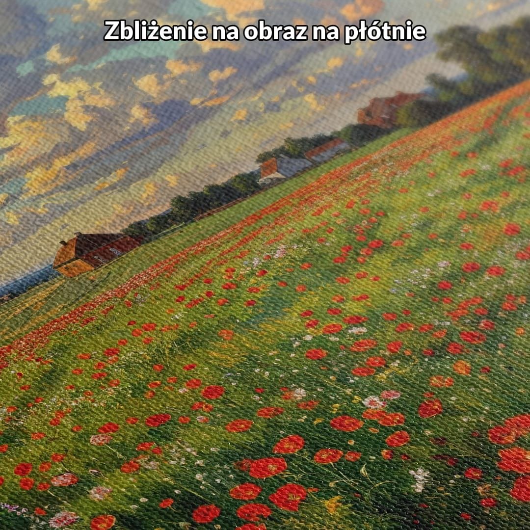 Obraz na płótnie ukazuje malowniczy, letni krajobraz z rozległym polem maków, rozciągającym się aż po linię horyzontu, gdzie w tle malują się urocze wiejskie domki. Na lazurowym niebie suną miękkie, puszyste chmury, które dopełniają sielankową i relaksującą atmosferę dzieła.