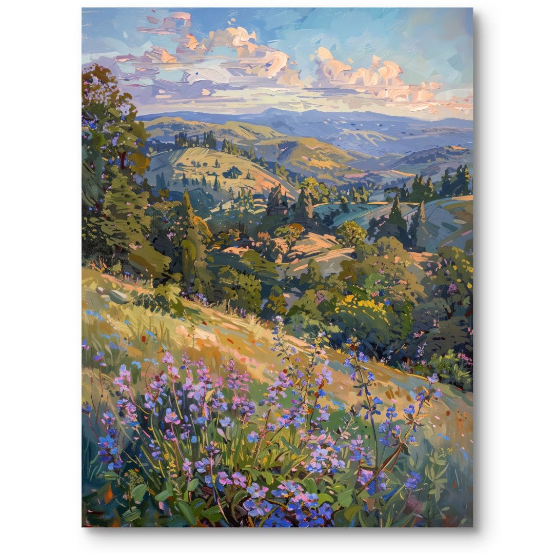 Kompozycja obrazu prowadzi wzrok od kwitnących roślin na pierwszym planie przez łagodne pagórki, aż ku odległym szczytom i przestrzennemu niebu. Żywe akcenty fioletu przeplatają się z kojącą zielenią, tworząc harmonijną całość. Delikatne światło nadaje krajobrazowi ciepła, otulając każdą scenę przyjazną aurą.