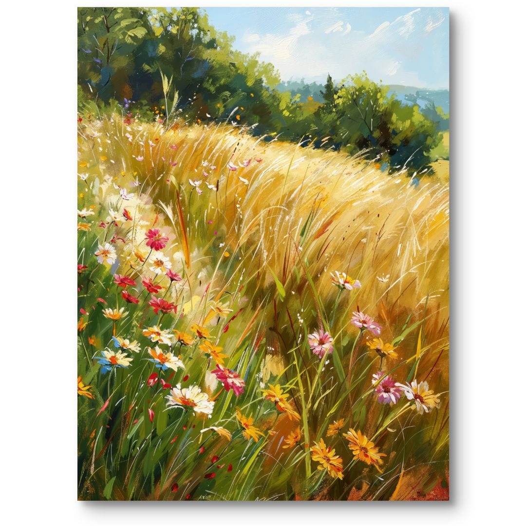 Obraz na płótnie ukazuje urzekający krajobraz letniej łąki tętniącej kolorami rozkwitłych kwiatów. Wśród dominujących odcieni soczystej zieleni i słonecznego złota wyczuwalna jest radość upalnego dnia. Bujne rośliny, majestatyczne trawy i delikatnie zarysowane drzewa w oddali tworzą pełną harmonii opowieść o pięknie natury oraz jej spokojnej, odprężającej sile.