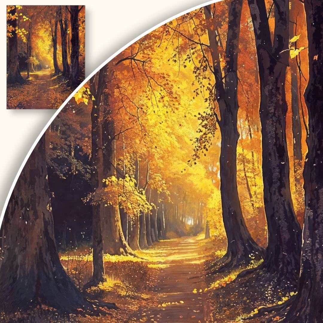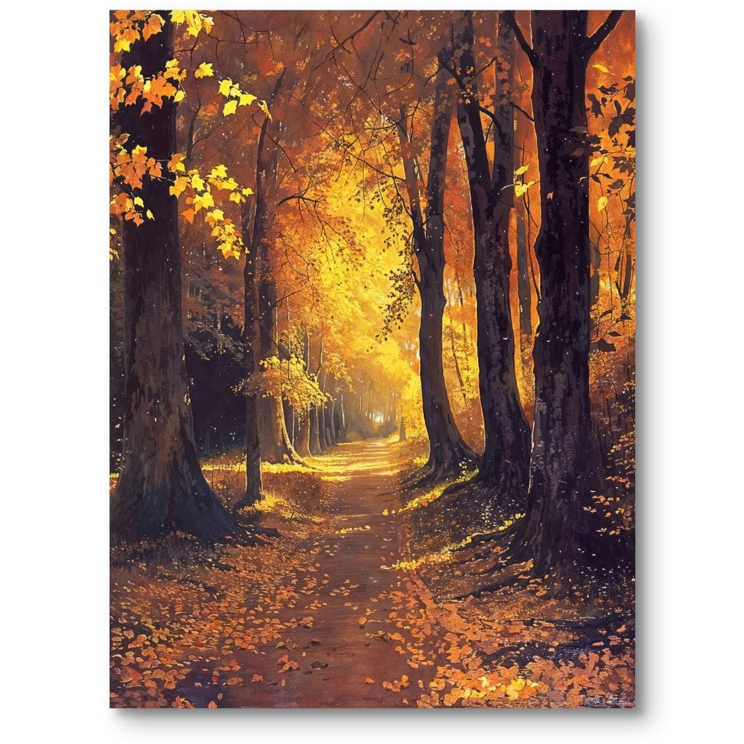 Obraz ukazuje malowniczy krajobraz jesiennego lasu, pełnego złocistych liści i ciepłych barw natury. Centralnym punktem kompozycji jest ścieżka biegnąca w głąb lasu, otulona wysokimi drzewami o kolorowych koronach, które kuszą różnorodnością jesiennej palety.