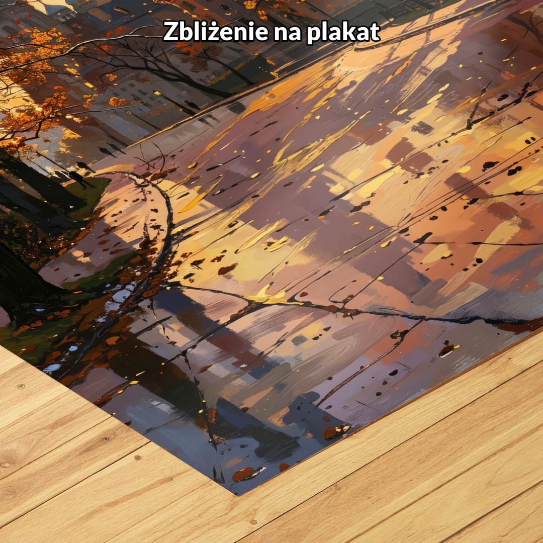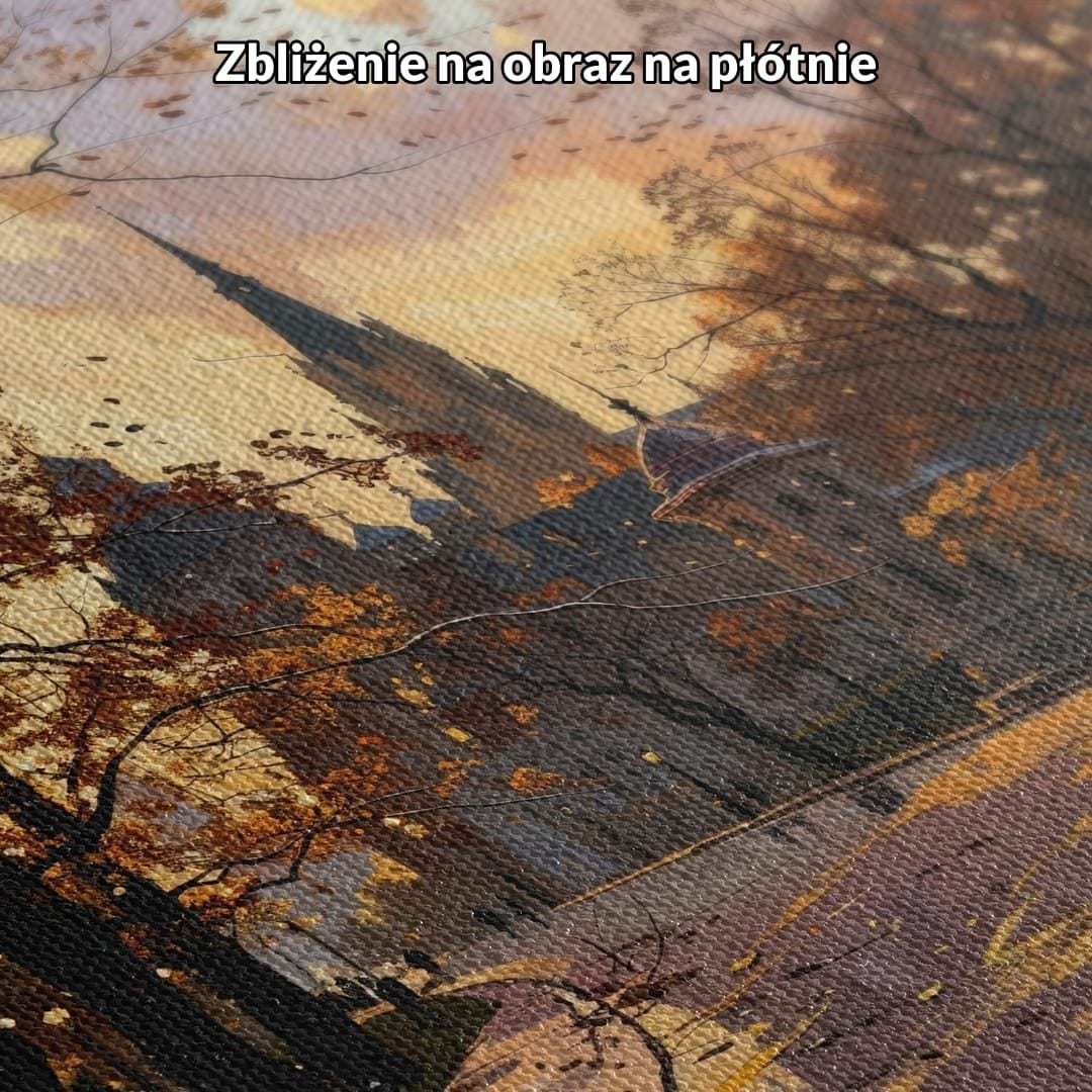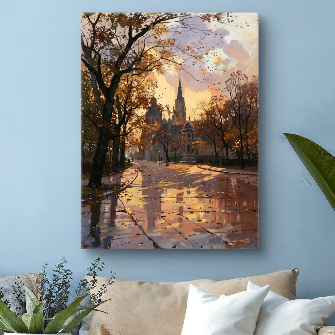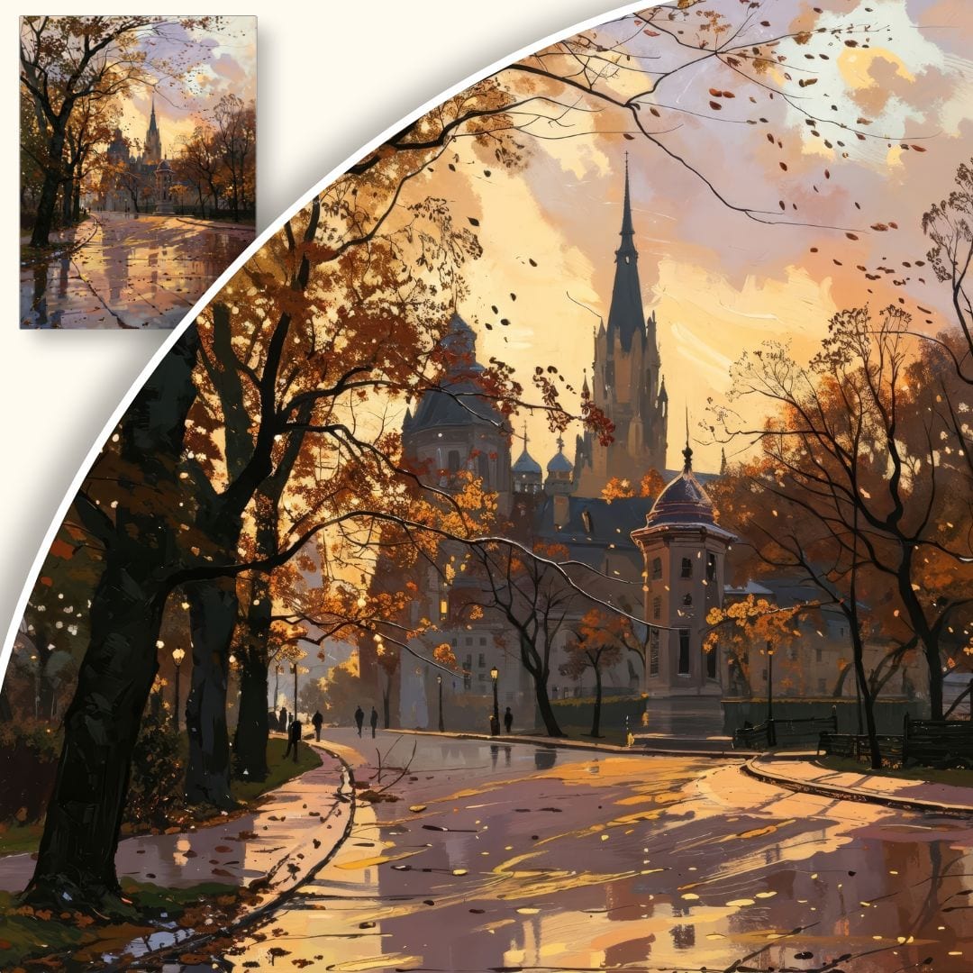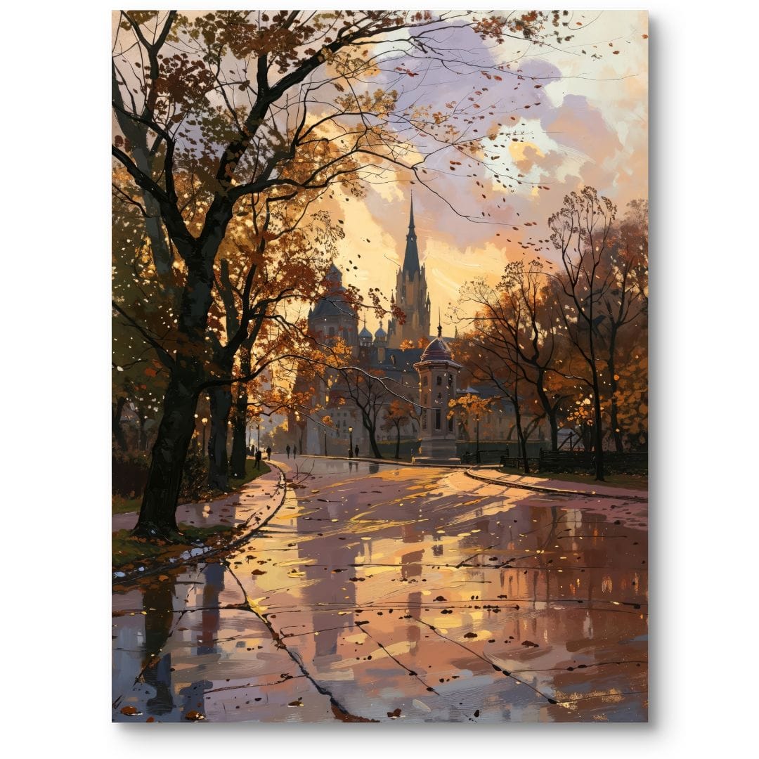 Ten urzekający obraz na płótnie przenosi widza w malowniczy, jesienny park, z majestatycznym zamkiem w tle. Promienie zachodzącego słońca delikatnie oświetlają aleję, tworząc nastrojowy, nostalgiczny pejzaż. Realistyczne odbicia światła w mokrej nawierzchni oraz subtelne cienie podkreślają wyjątkową atmosferę tej chwili.