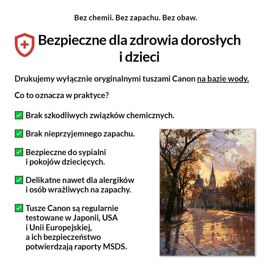 My drukujemy wyłącznie na pigmentowych tuszach Canon LUCIA PRO, bezpiecznych, bezzapachowych i certyfikowanych.