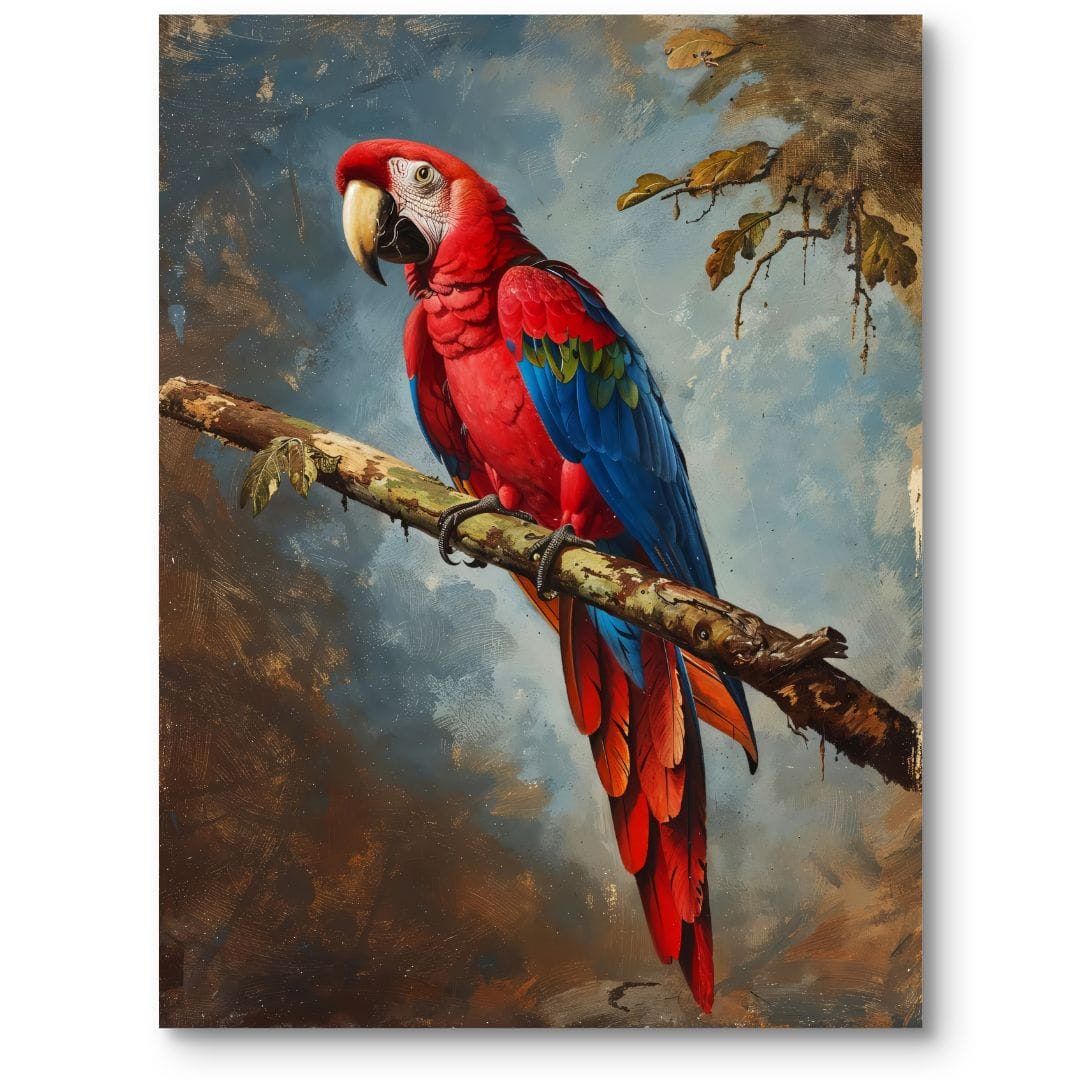 Obraz na płótnie przedstawia zachwycająco realistyczną papugę, odpoczywającą na gałęzi w otoczeniu natury. Intensywne odcienie czerwieni i błękitu efektownie kontrastują z soczystą zielenią skrzydeł, kreując niezwykle barwny, przyciągający wzrok motyw. Delikatnie zarysowane tło, sugerujące niebo i drzewa, subtelnie podkreśla naturalność scenerii i wydobywa na pierwszy plan majestatyczną postać ptaka.
