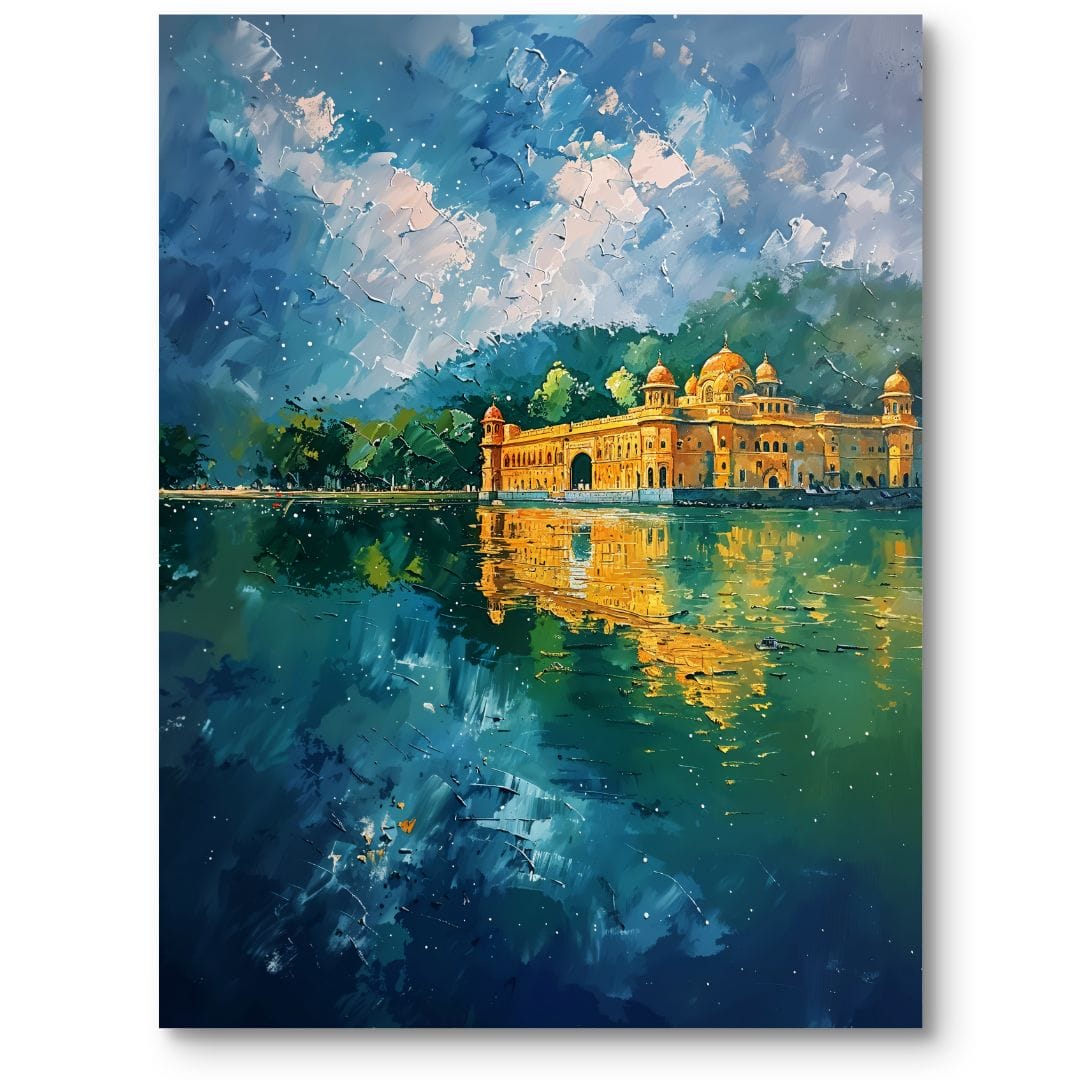 Obraz na płótnie ukazuje malowniczy pałac położony nad spokojną taflą wody, otoczony zielonymi wzgórzami oraz pod dramatycznie rozświetlonym niebem. Wyjątkowa symetria kompozycji, w której pałac odbija się niczym lustro w wodzie, potęguje wrażenie harmonii i ukojenia. To zaproszenie do egzotycznego świata, gdzie kunszt architektury doskonale współgra z nieokiełznaną naturą.