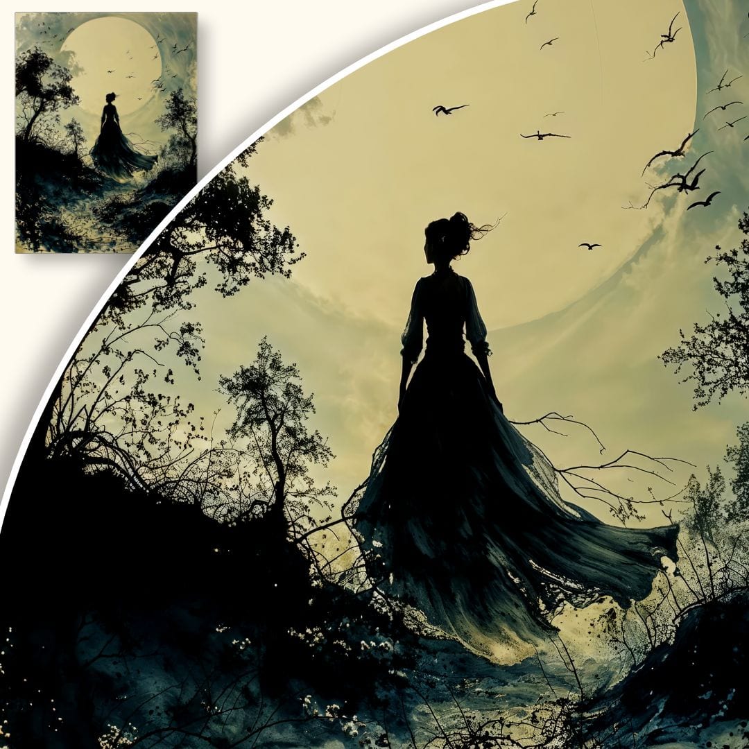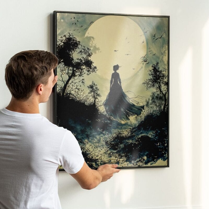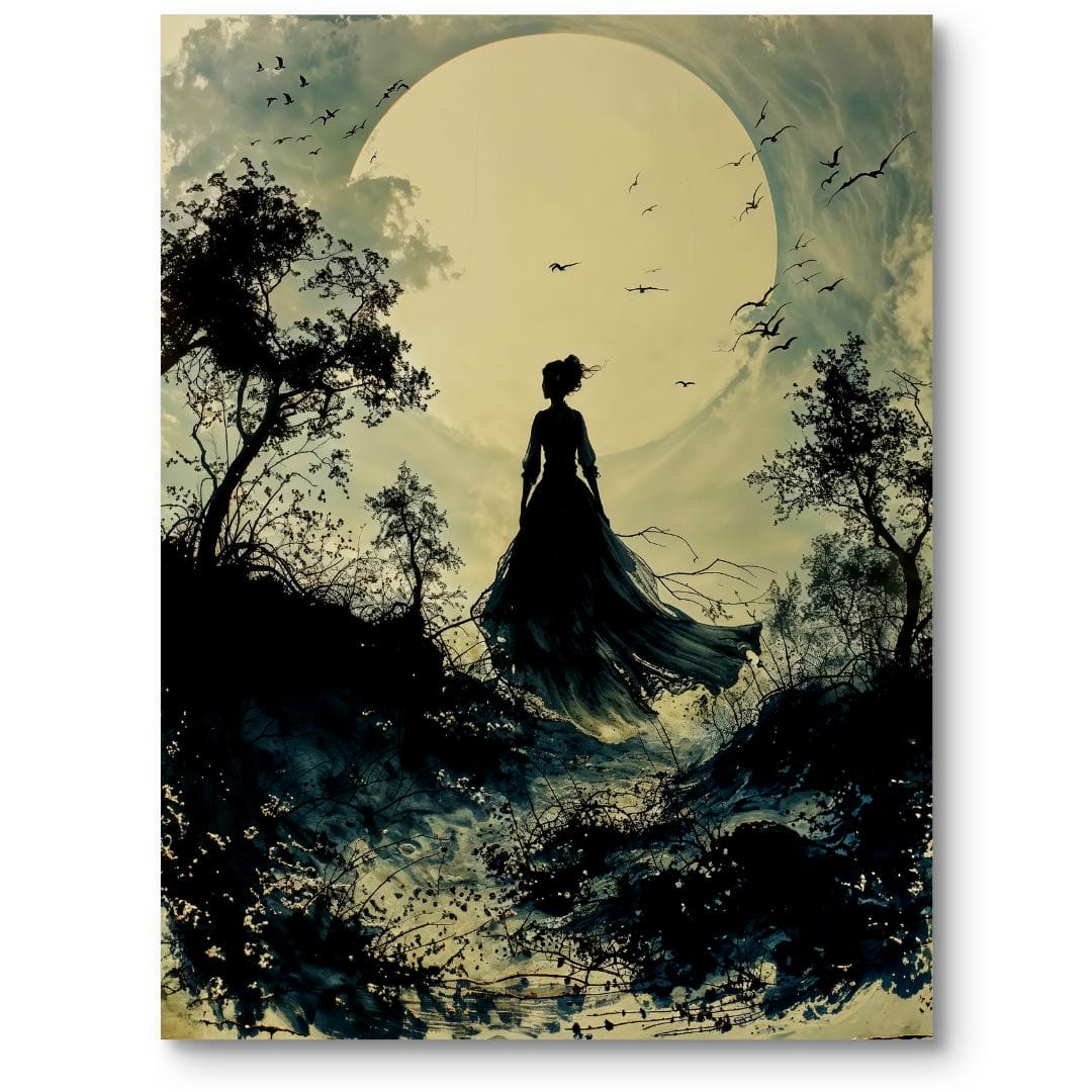 Obraz na płótnie ukazuje samotną kobietę stojącą na tle majestatycznego, pełnego księżyca. Tajemnicza sylwetka, otoczona cichym szpalerem drzew i towarzyszącymi jej przelotnymi ptakami, tworzy atmosferę pełną magii i niedopowiedzeń. Elementy natury – drzewa i ptaki – potęgują głębię sceny i podkreślają aurę tajemnicy otaczającą postać.