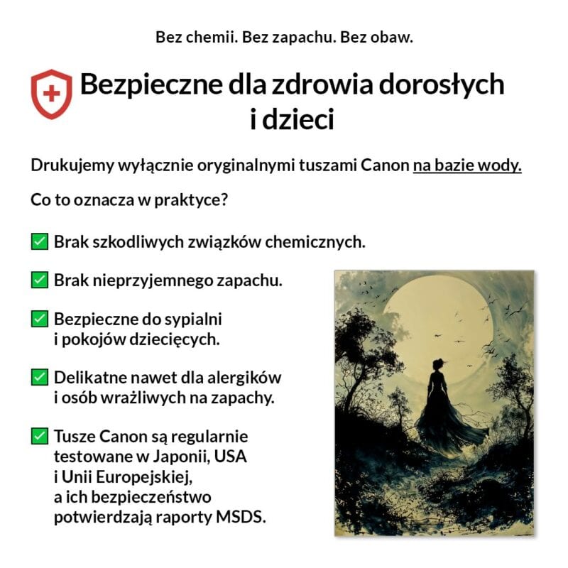 Tak, absolutnie! Drukujemy wyłącznie certyfikowanymi, bezwonnymi tuszami pigmentowymi Canon Lucia Pro na bazie wody. Są one w pełni bezpieczne dla zdrowia, nie zawierają rozpuszczalników i mogą być bez obaw stosowane w sypialniach i pokojach dziecięcych.