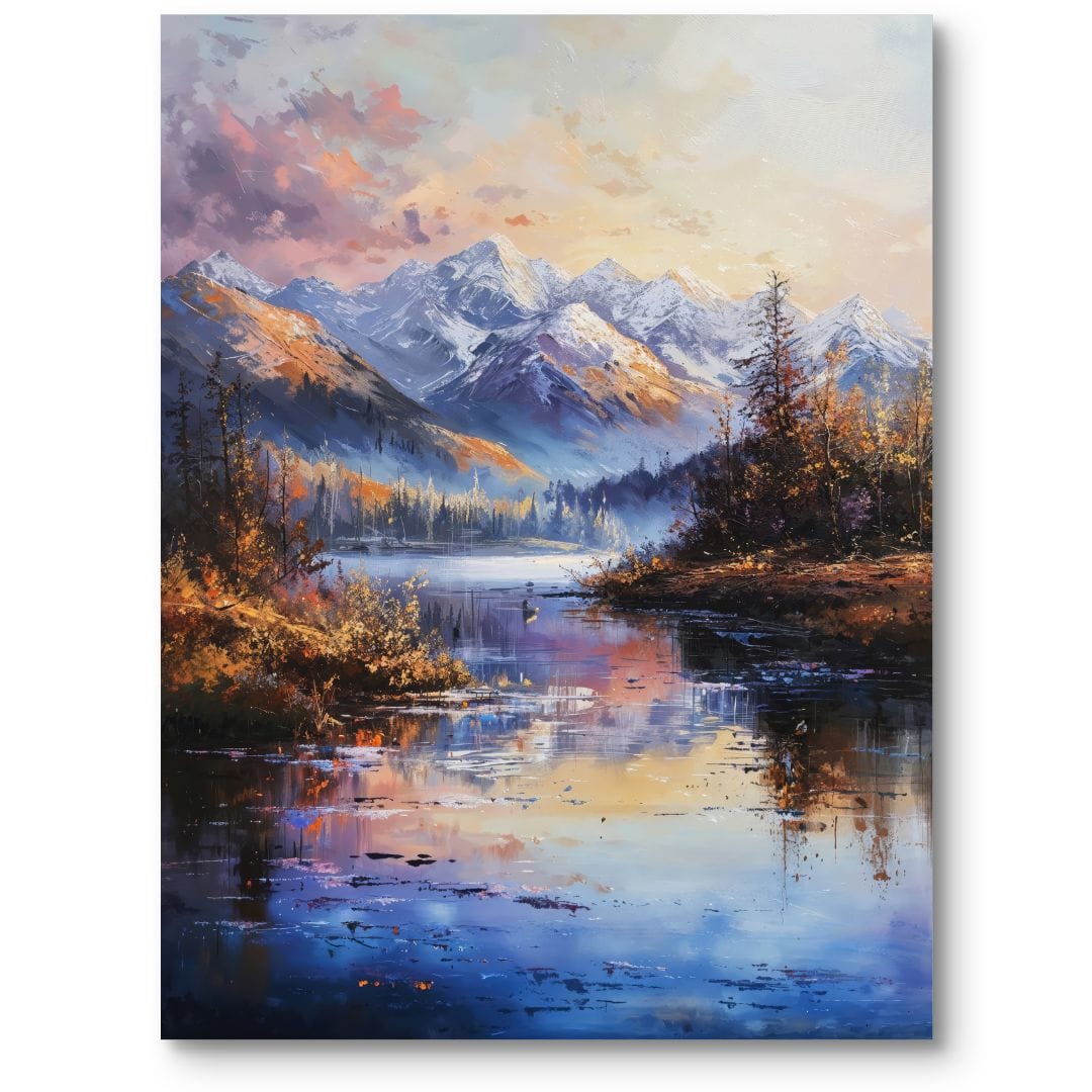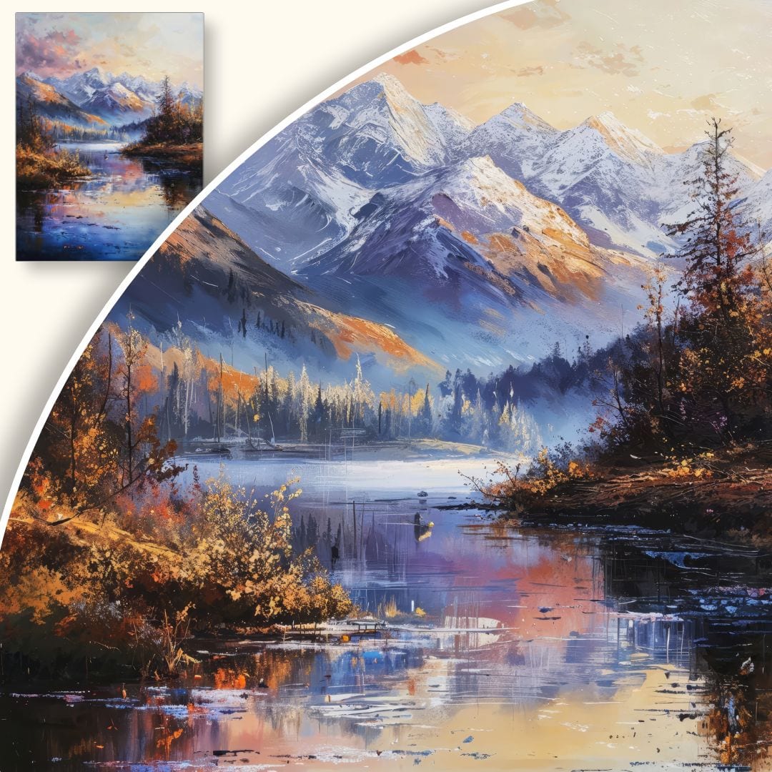 Obraz na płótnie ukazuje urokliwy krajobraz górski z jeziorem w centrum kompozycji. Otaczające je majestatyczne szczyty, spowite śniegiem, kontrastują z pierwszym planem rozświetlonym przez złociste, jesienne drzewa. To wyjątkowe dzieło przenosi widza w świat natury, niosąc ukojenie i wewnętrzną harmonię.